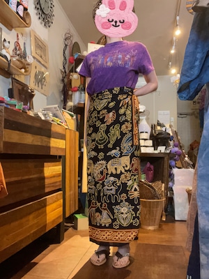 アジアンテイストを取り入れたハンドメイドのスカートは、独自のデザインで個性的。