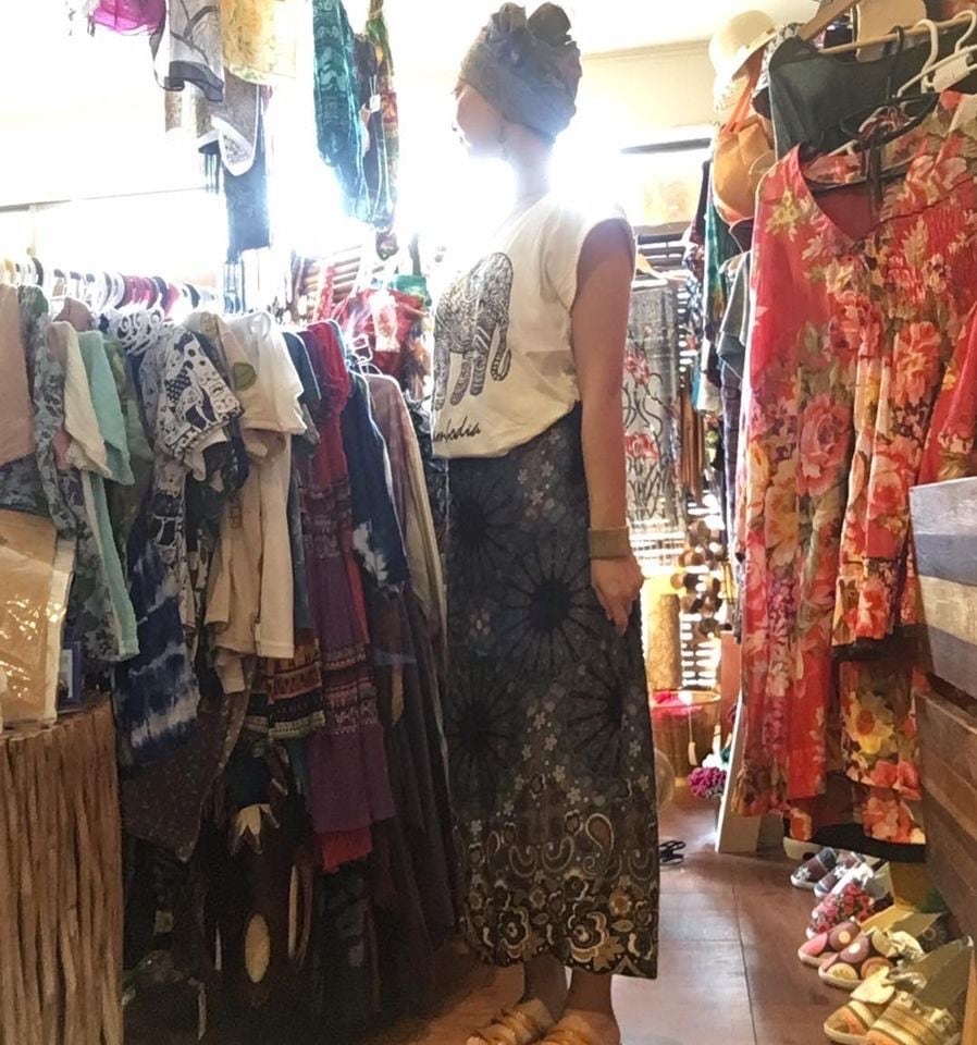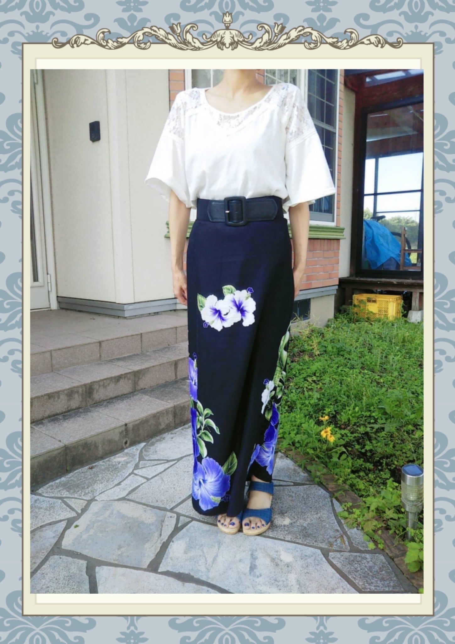 アジアンテイストを取り入れたハンドメイドのスカートは、独自のデザインで個性的。