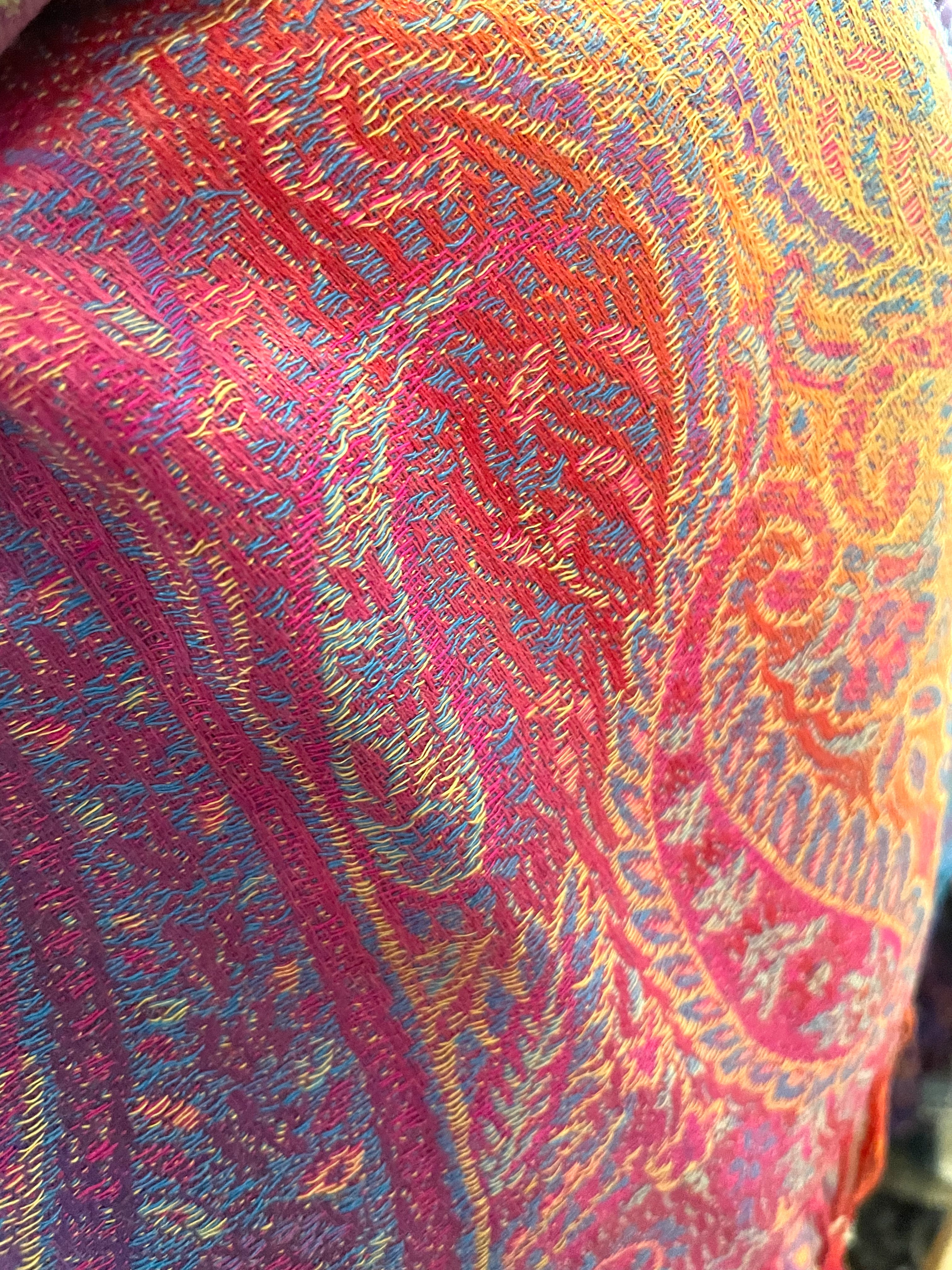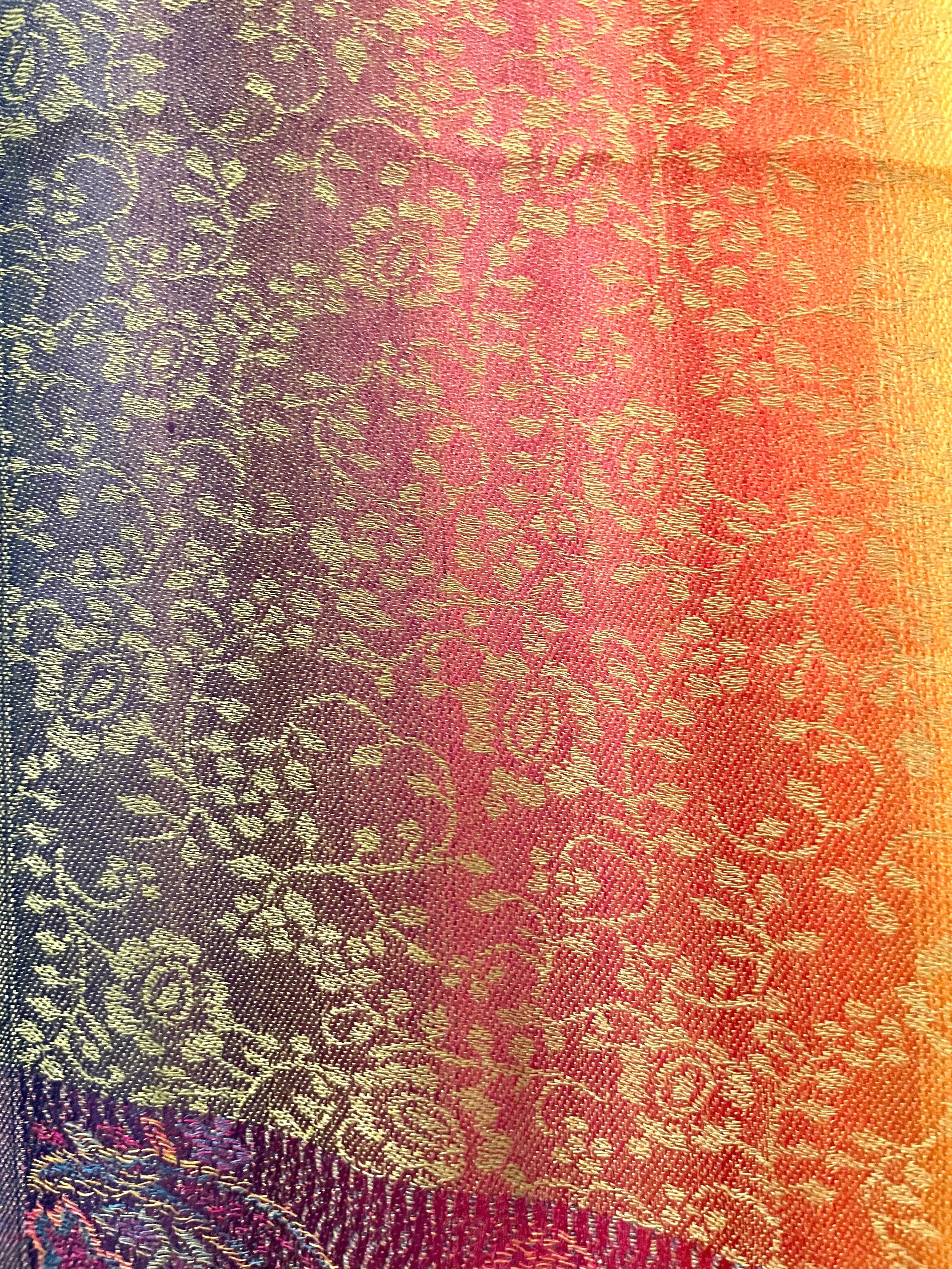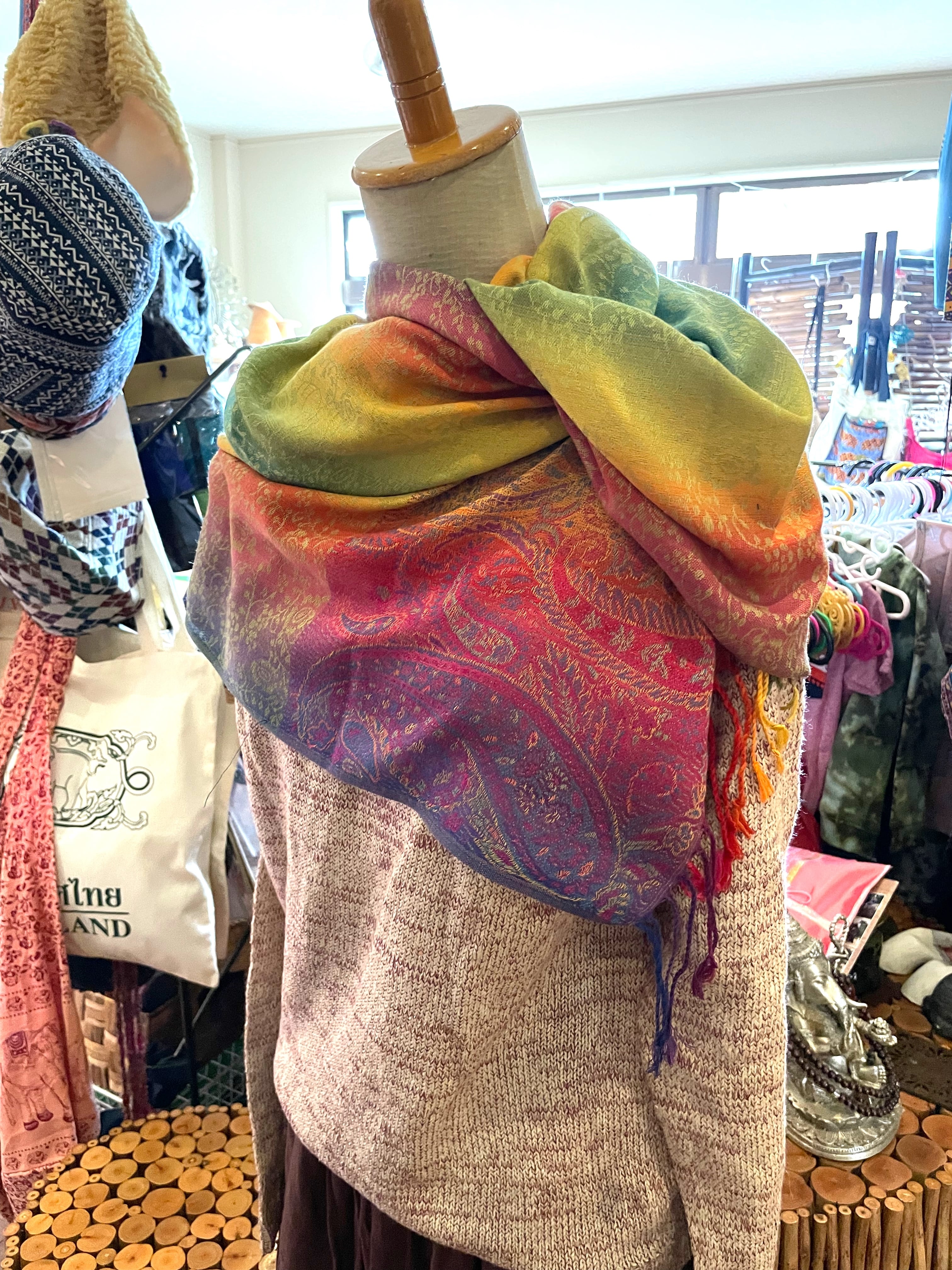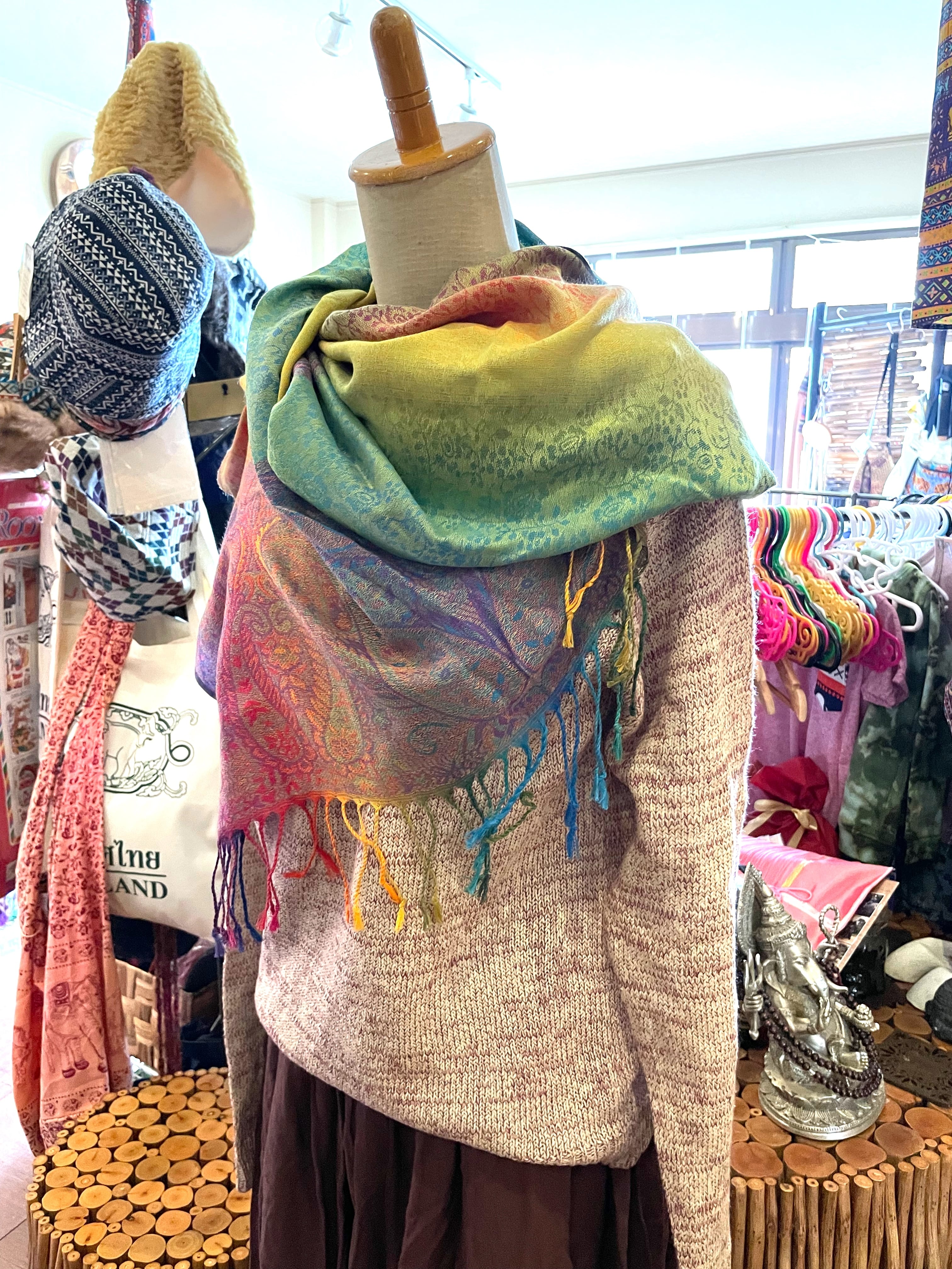 パシュミナストールは、カシミアの繊維を糸に紡ぎ織り上げるため生地が薄く光沢感が高いという特徴を持ちます。