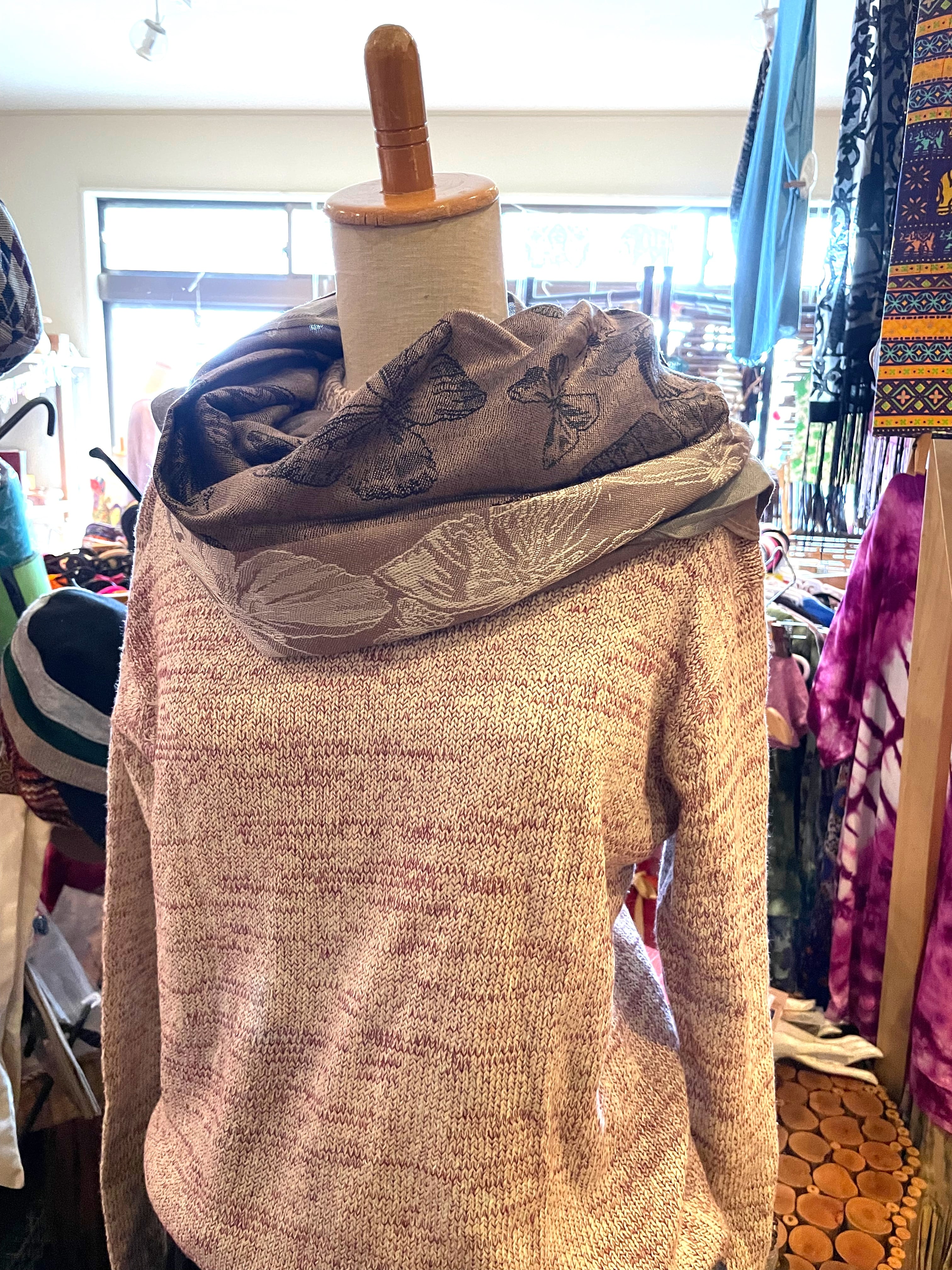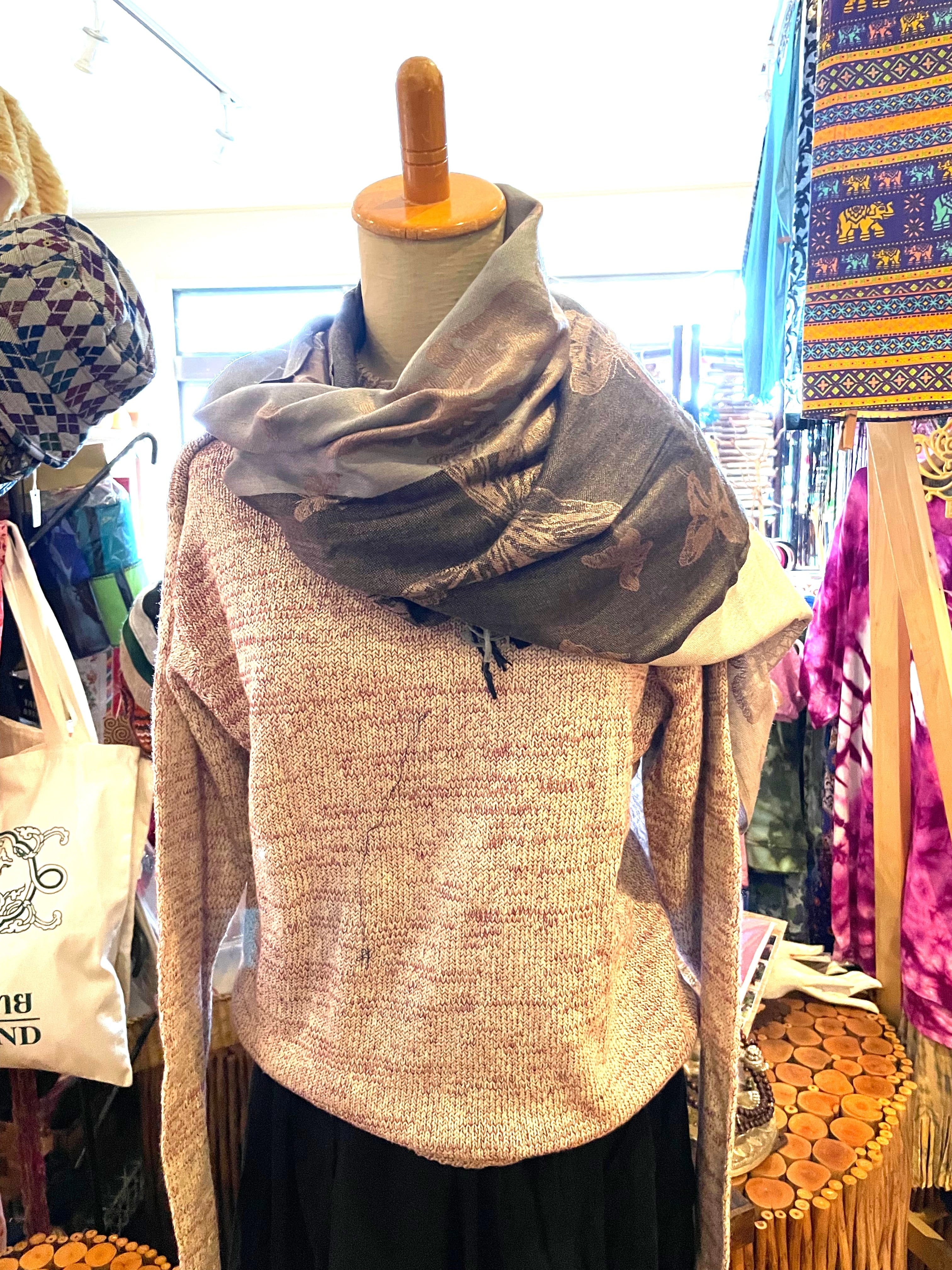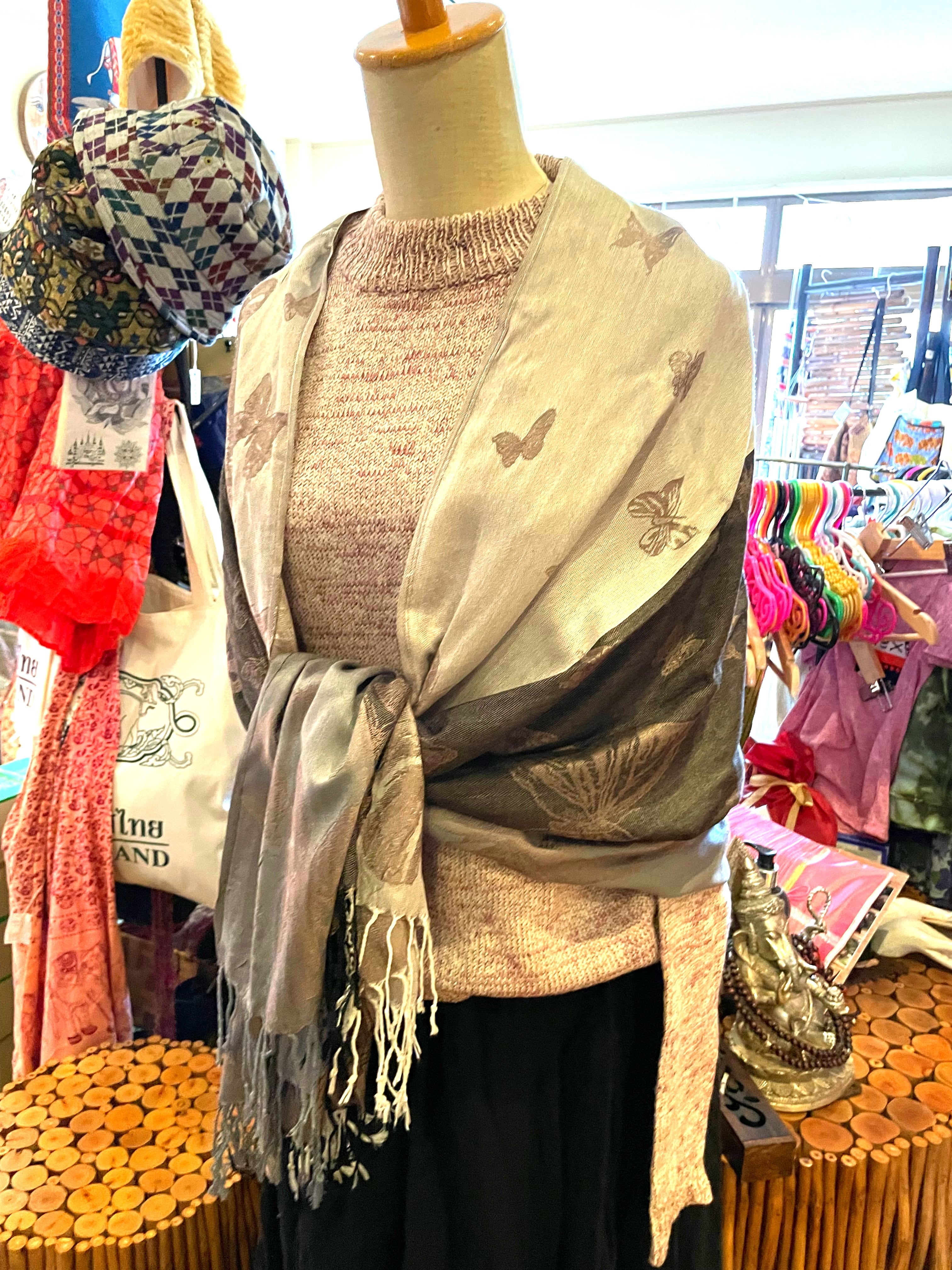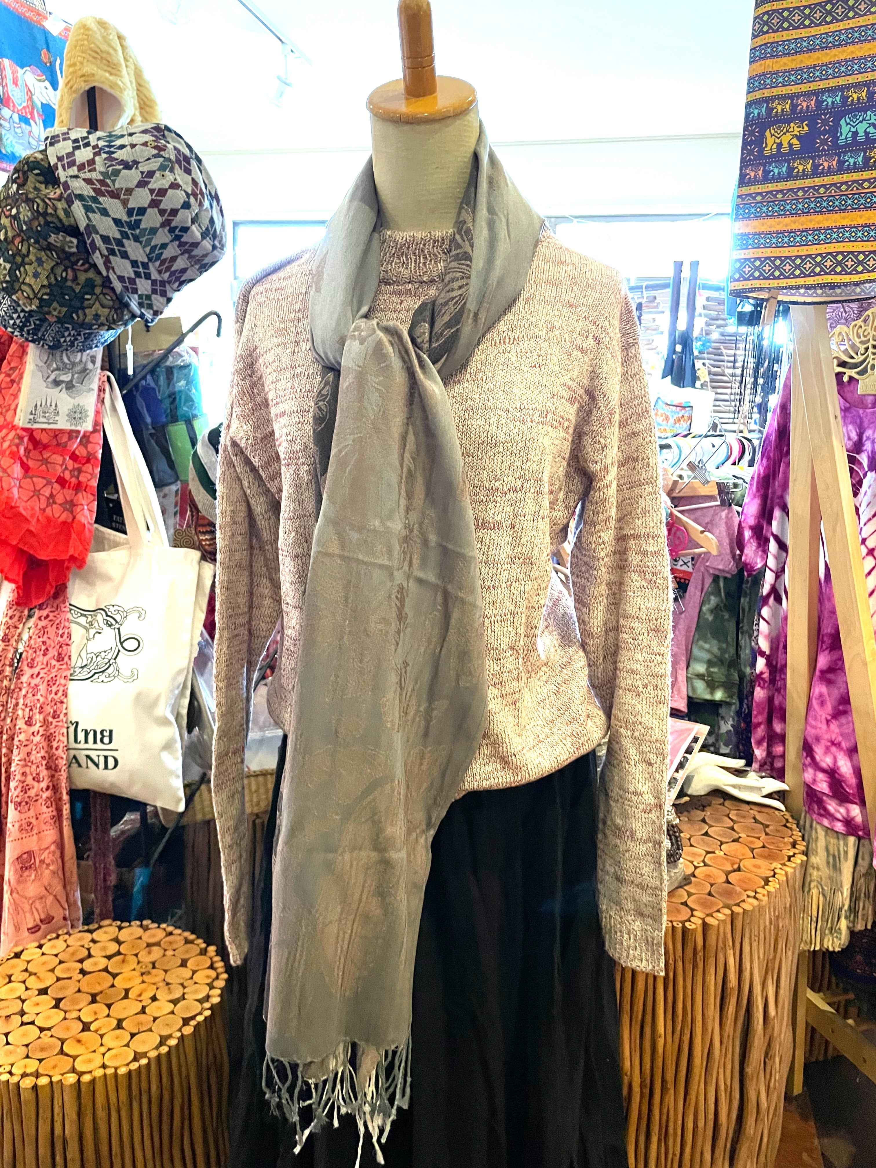 パシュミナストールは、カシミアの繊維を糸に紡ぎ織りあげるため、軽く・薄く・光沢感が高いという特徴を持ちます。