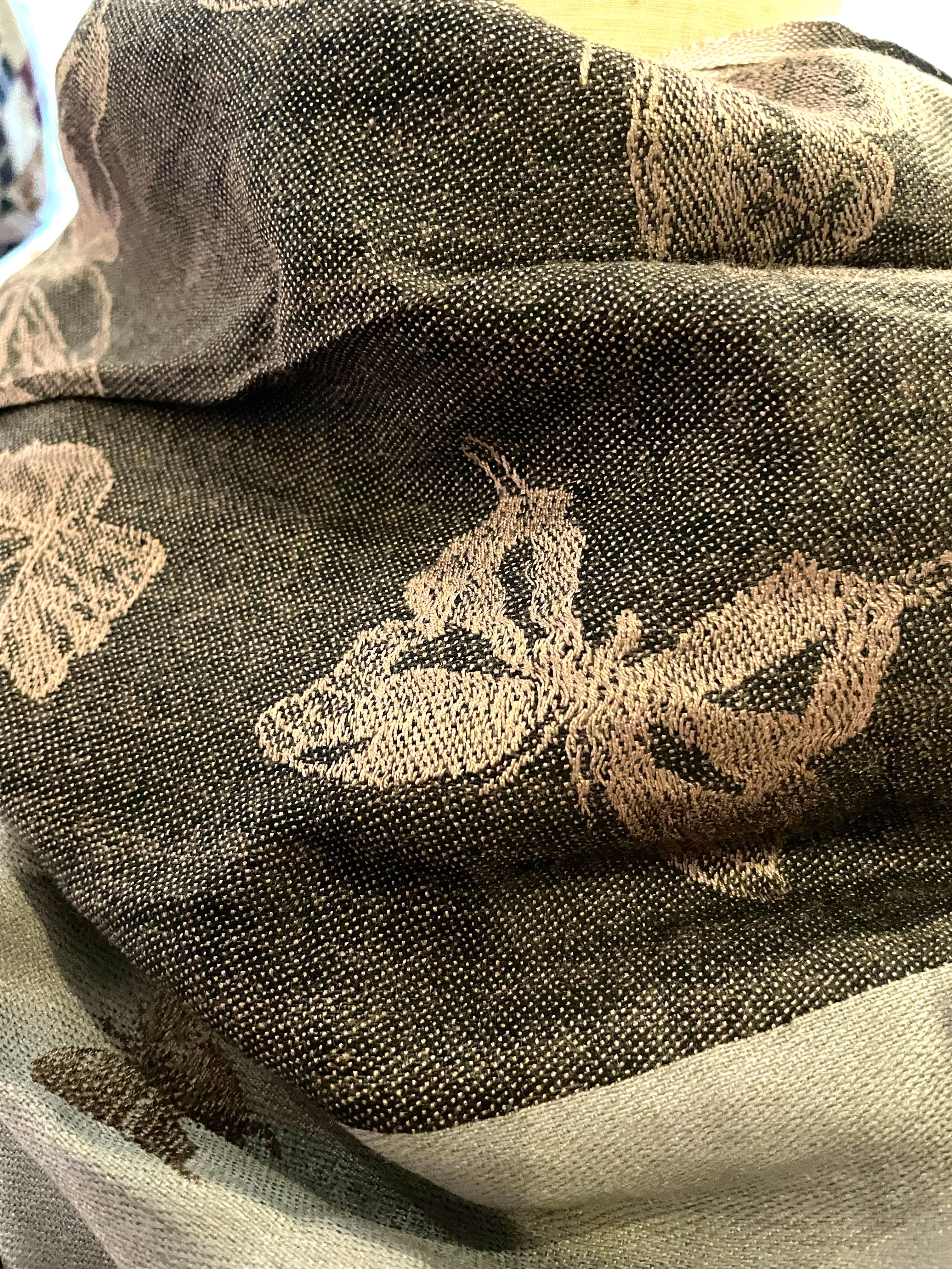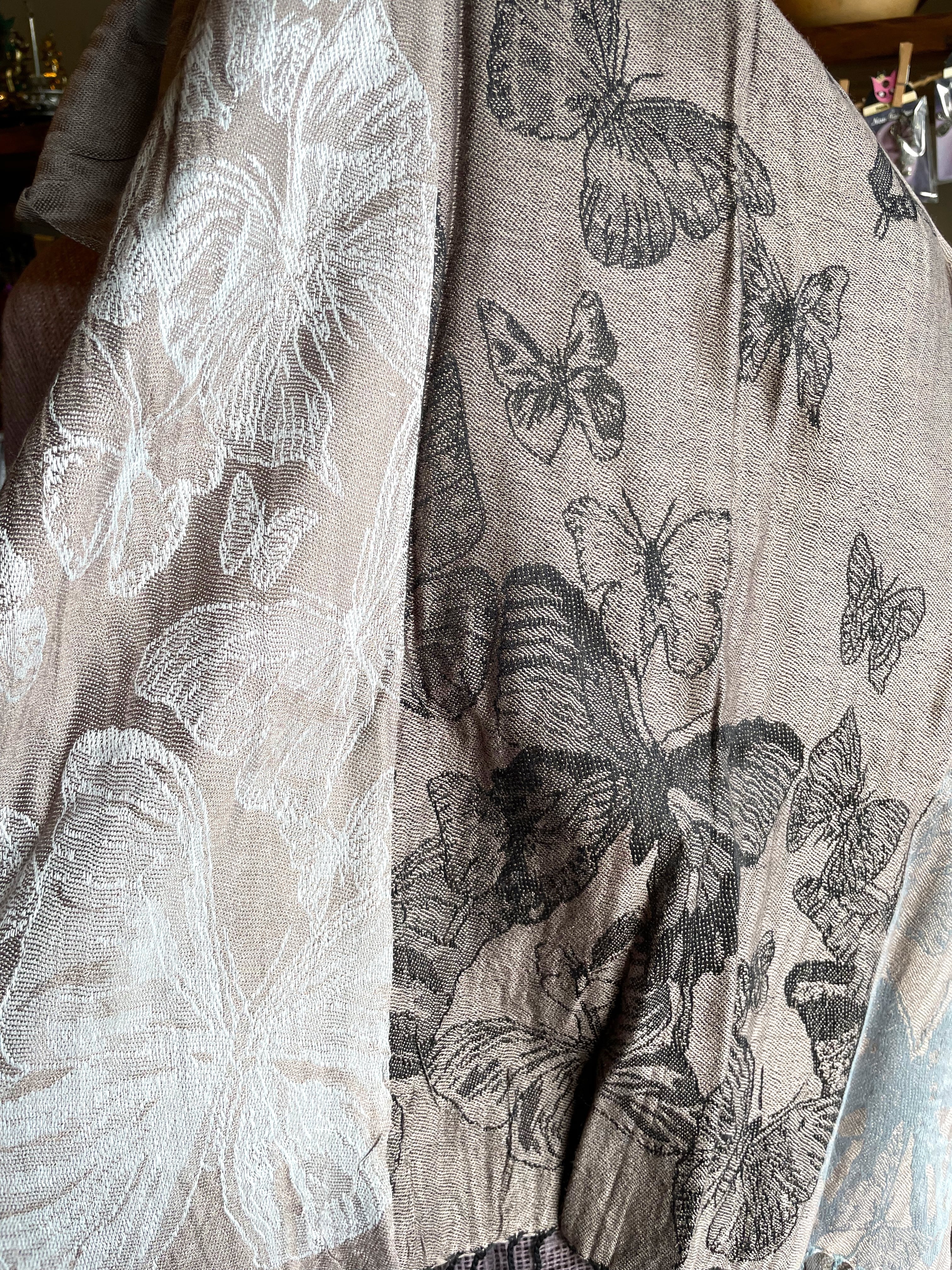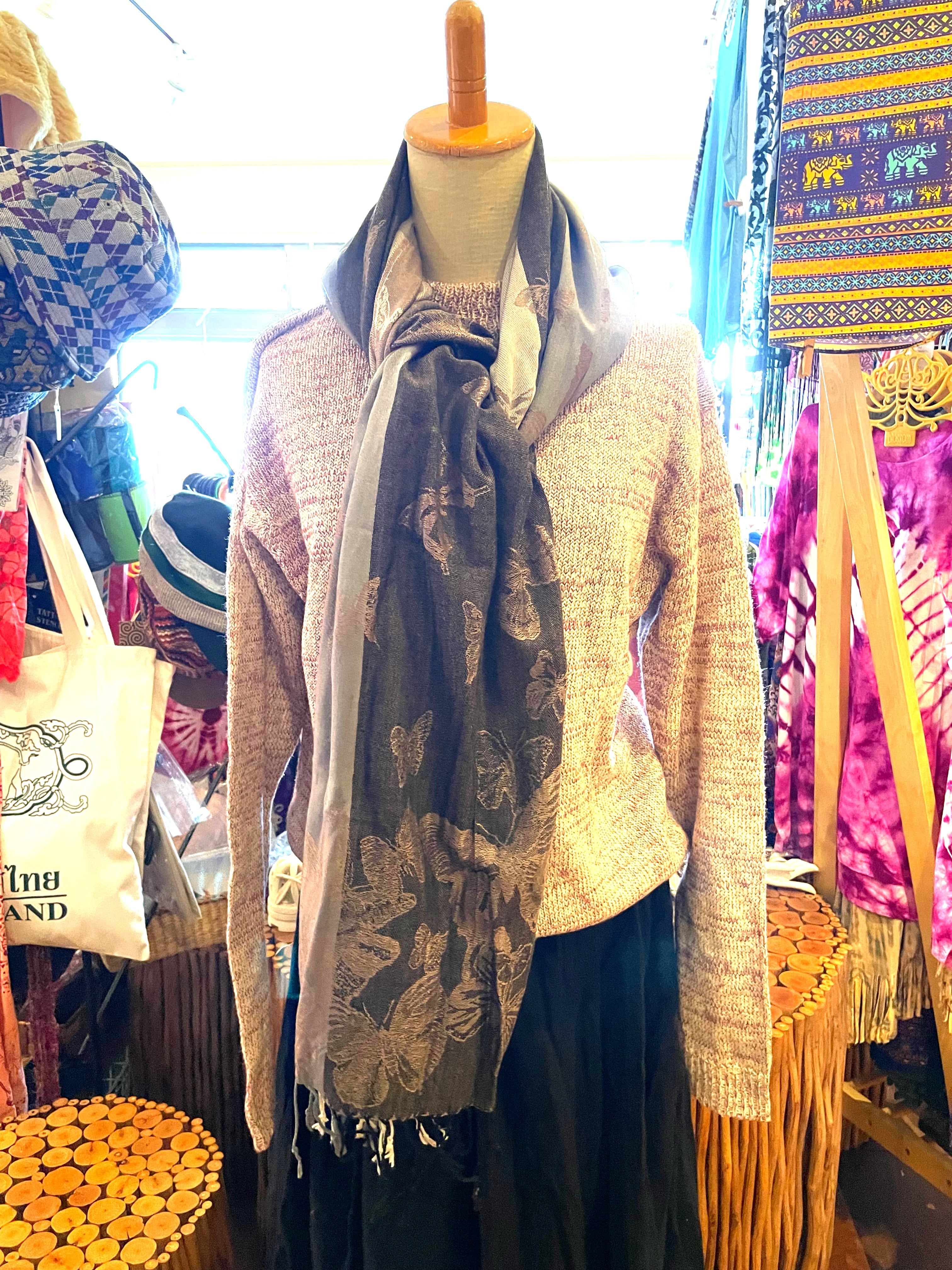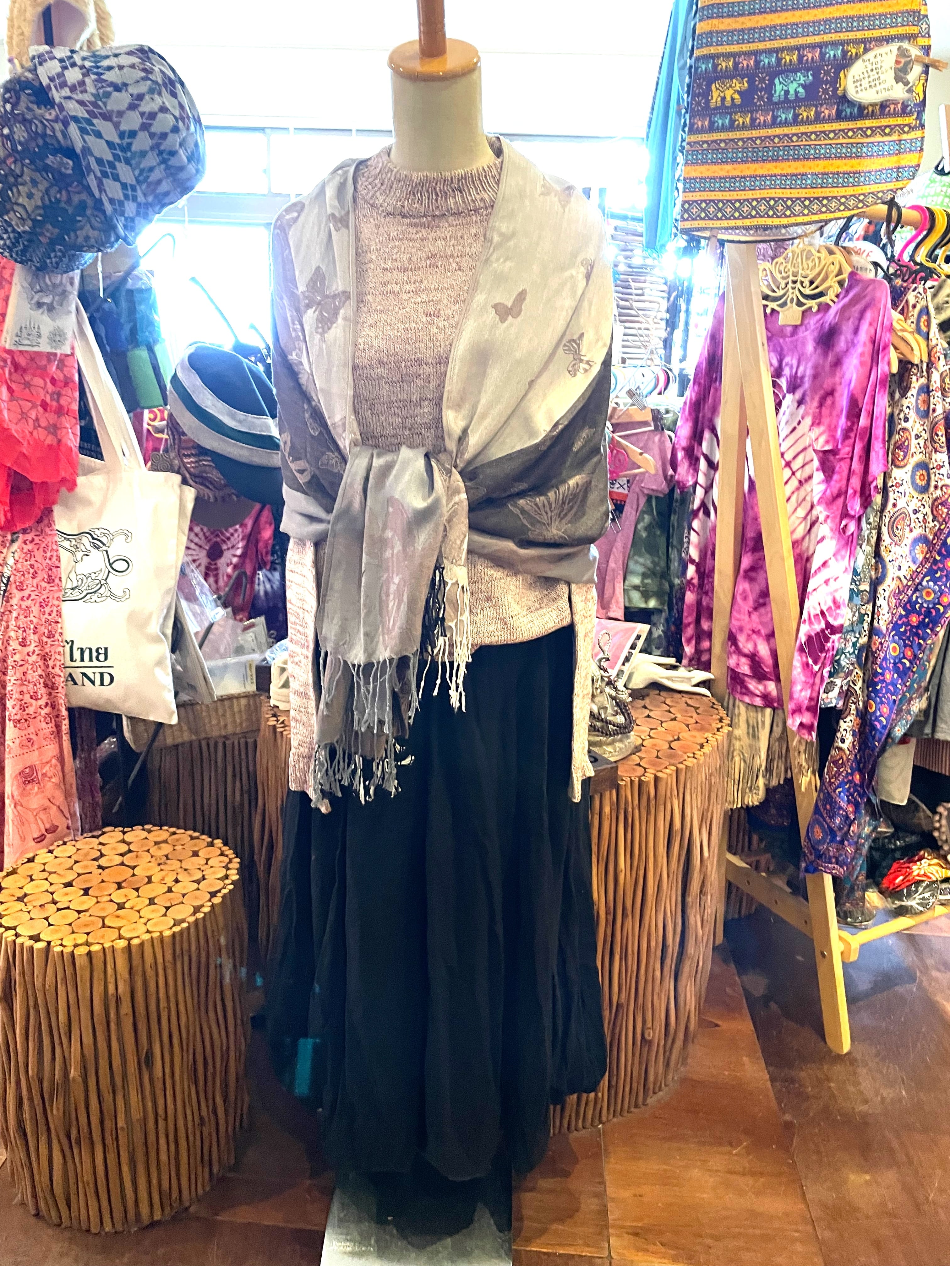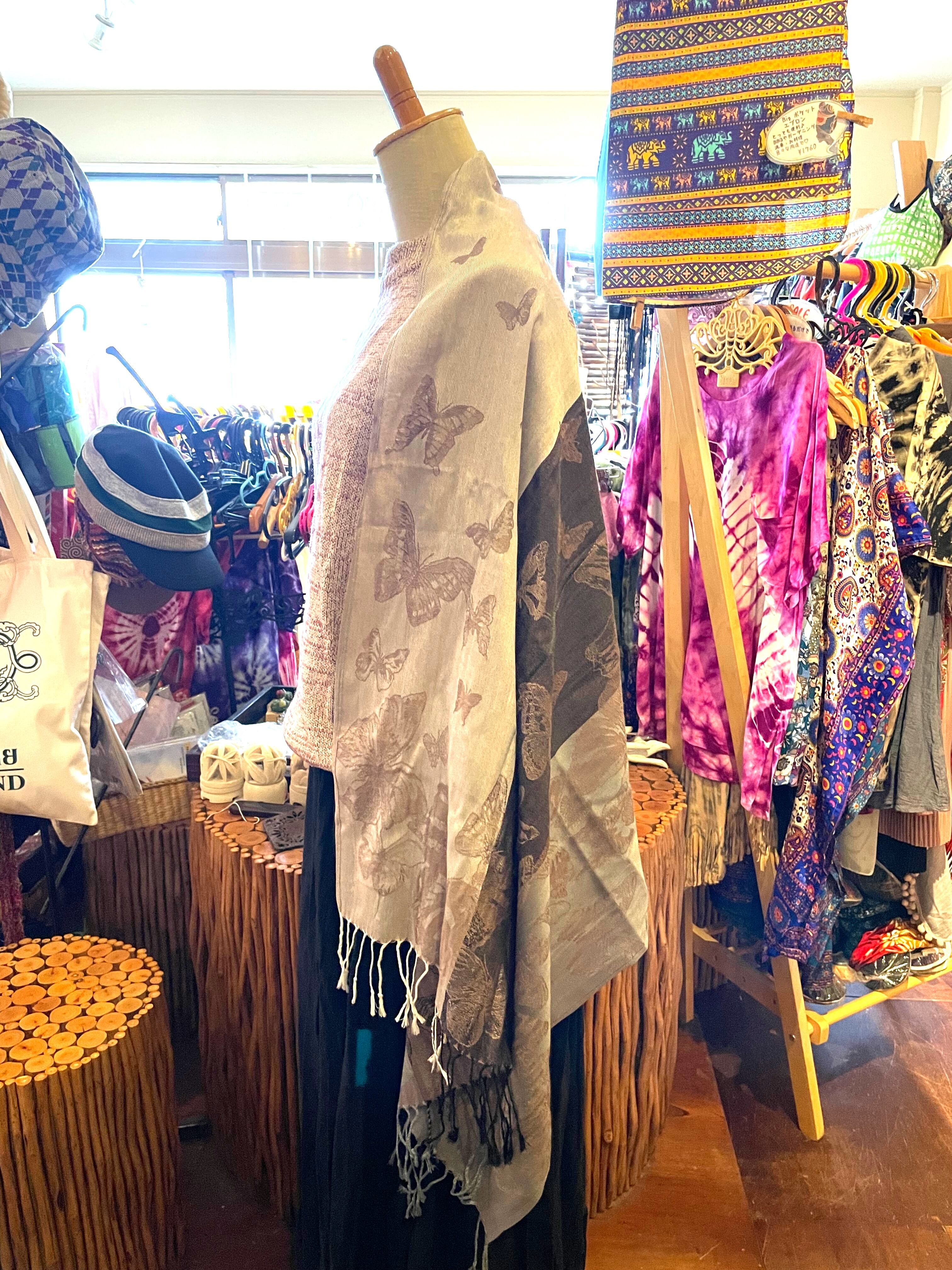 パシュミナストールは、カシミアの繊維を糸に紡ぎ織りあげるため、軽く・薄く・光沢感が高いという特徴を持ちます。