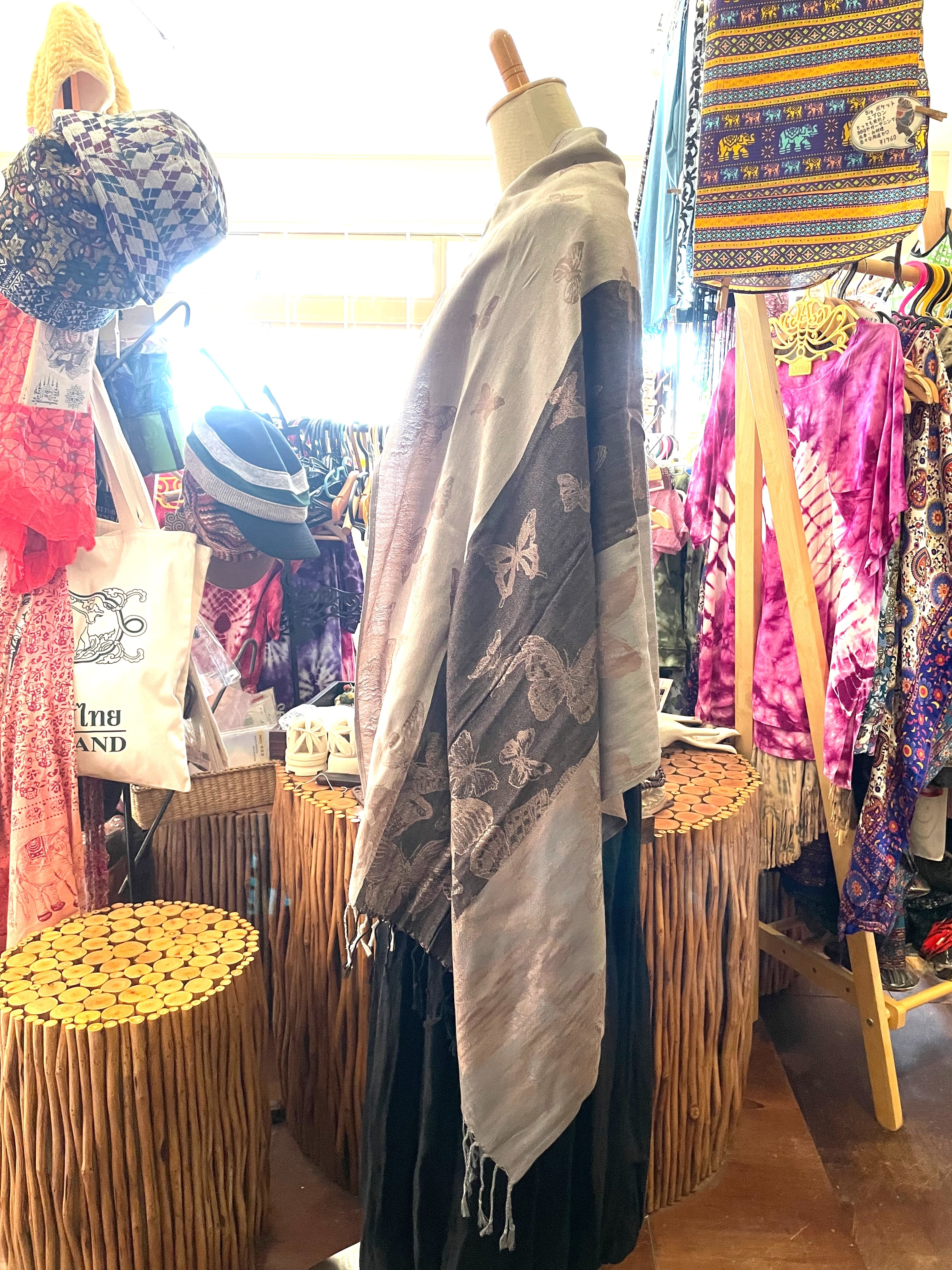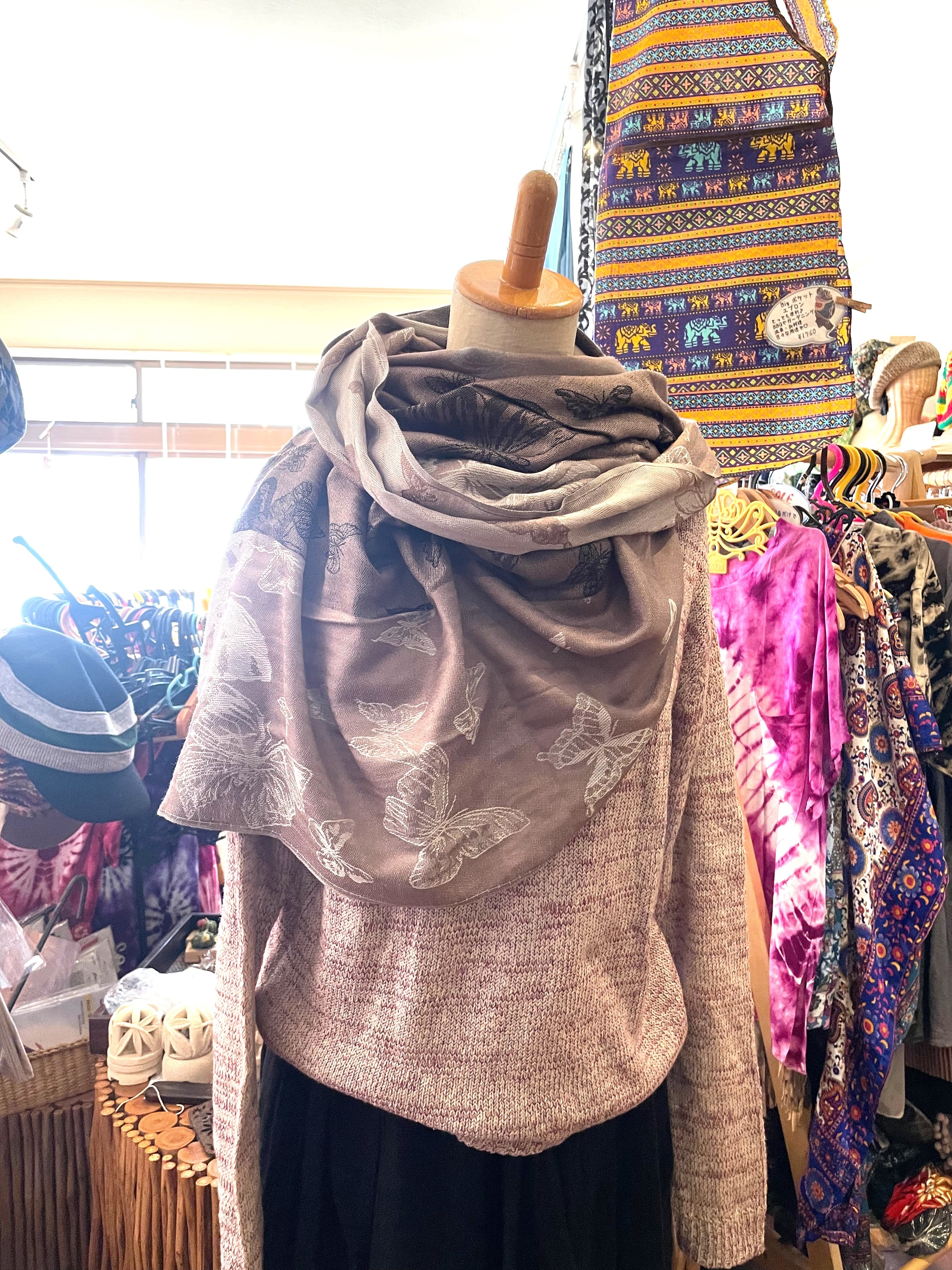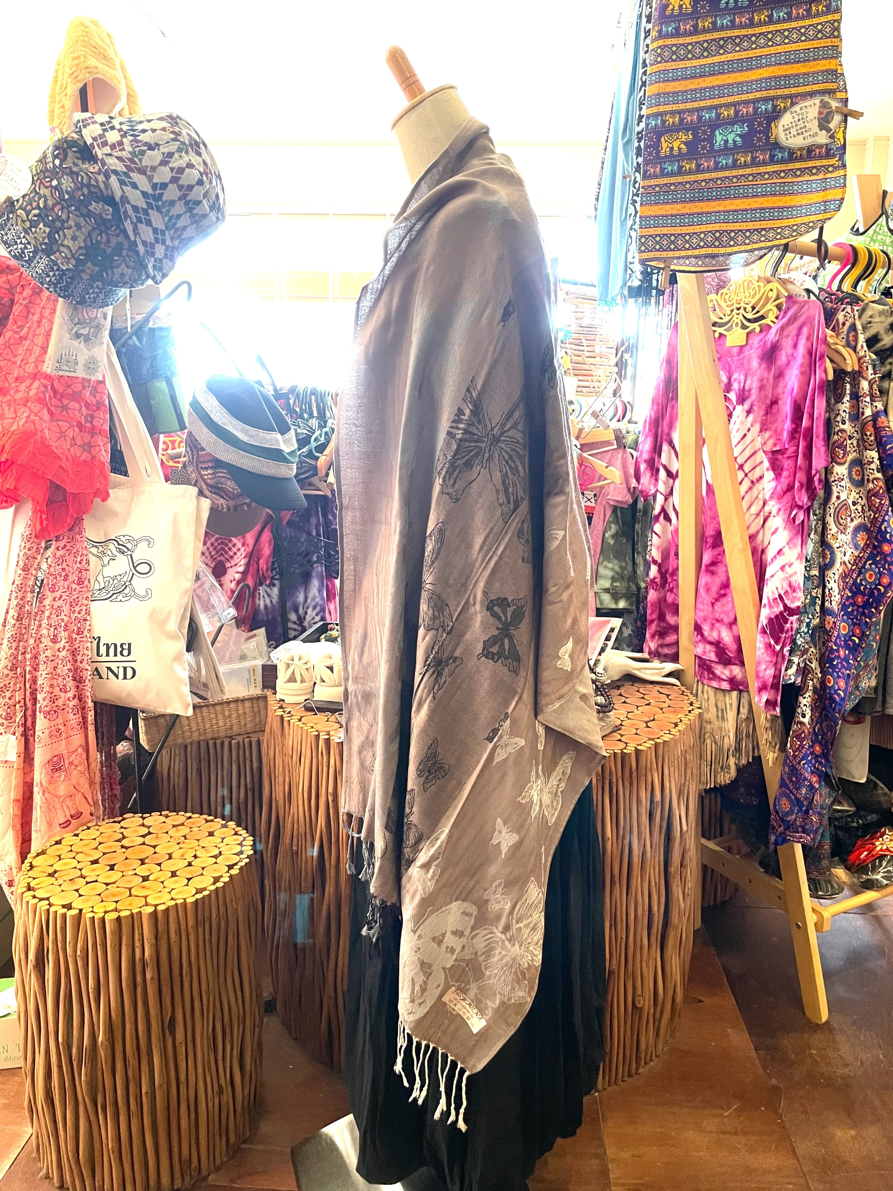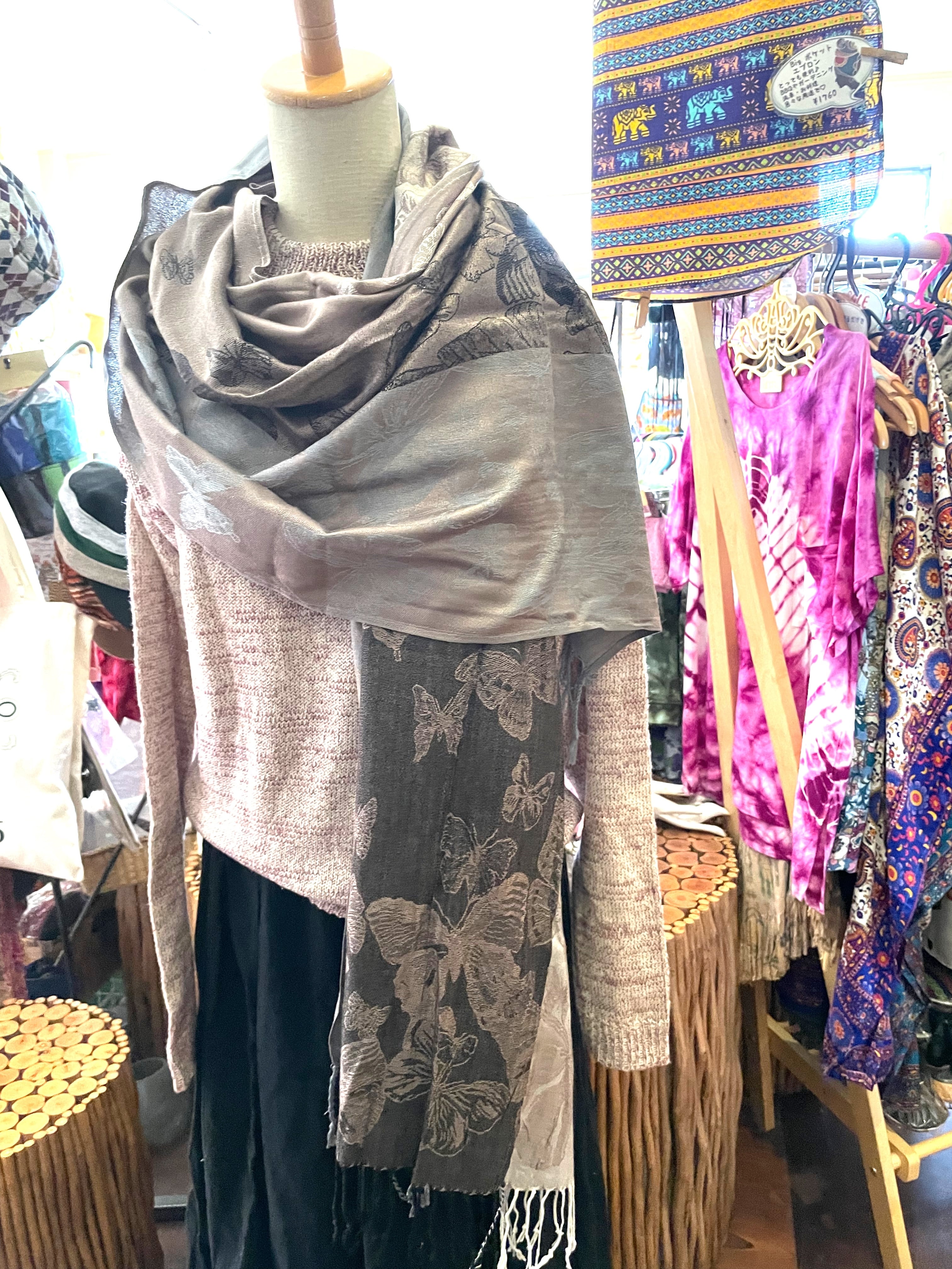 ストール 大判ストール 上品 柔らかい 光沢 リバーシブル リバーシブルストール 春 夏 秋 冬 マフラー アジアンストール 柄 エスニックファッション アフリカン エスニック パーティー プレゼント アジアン 蝶々柄 ライトブラウン グレー * アジアン雑貨 No.18 B