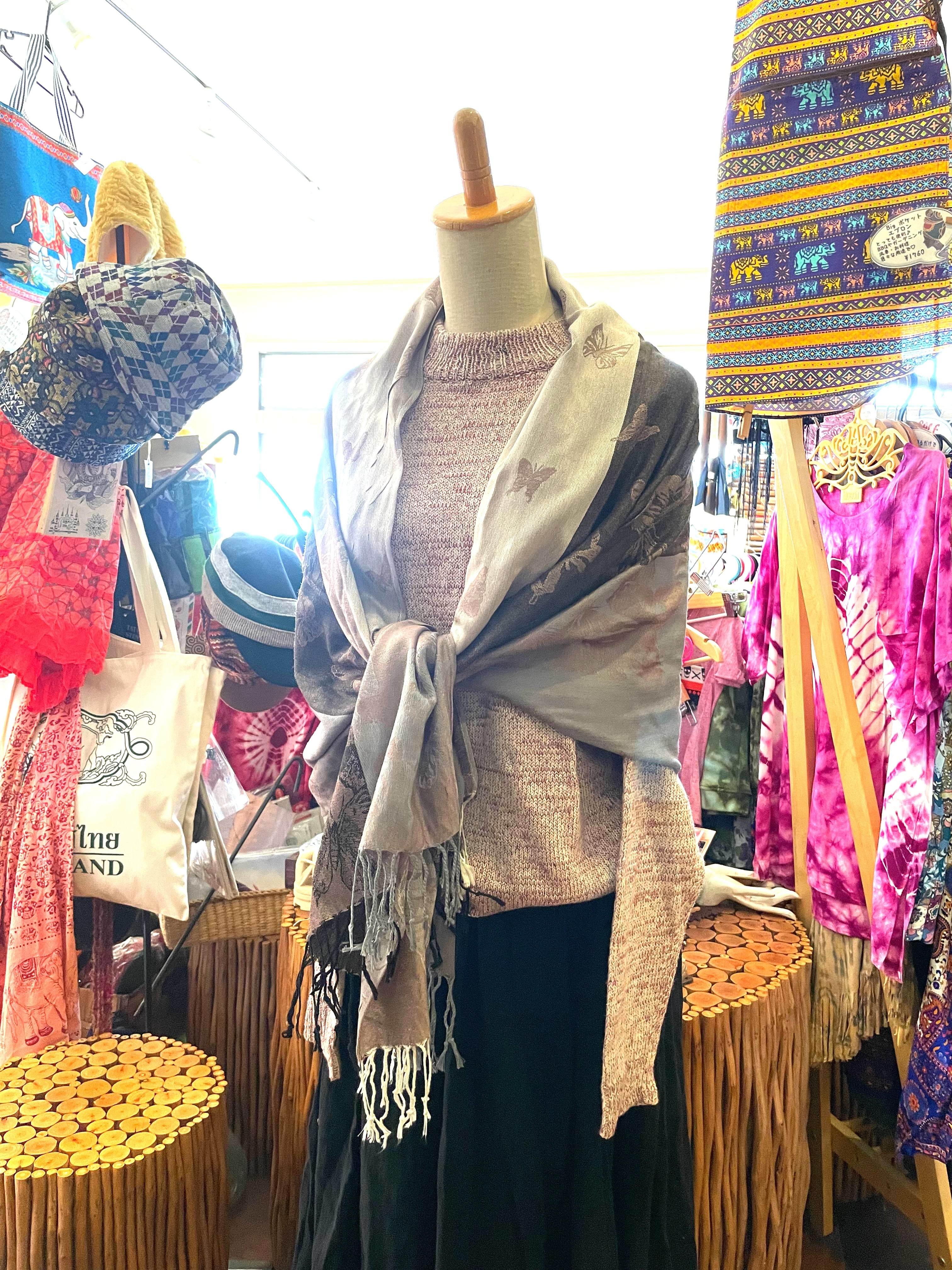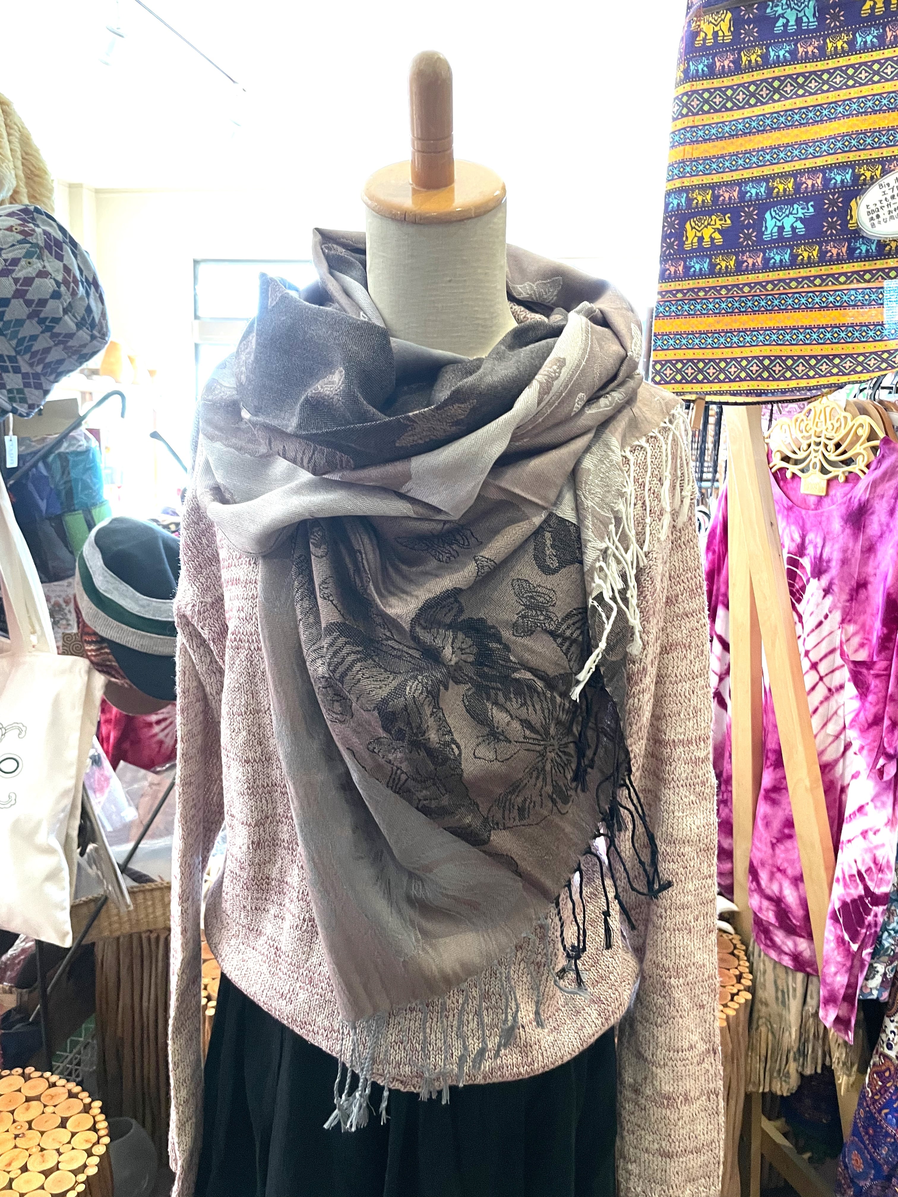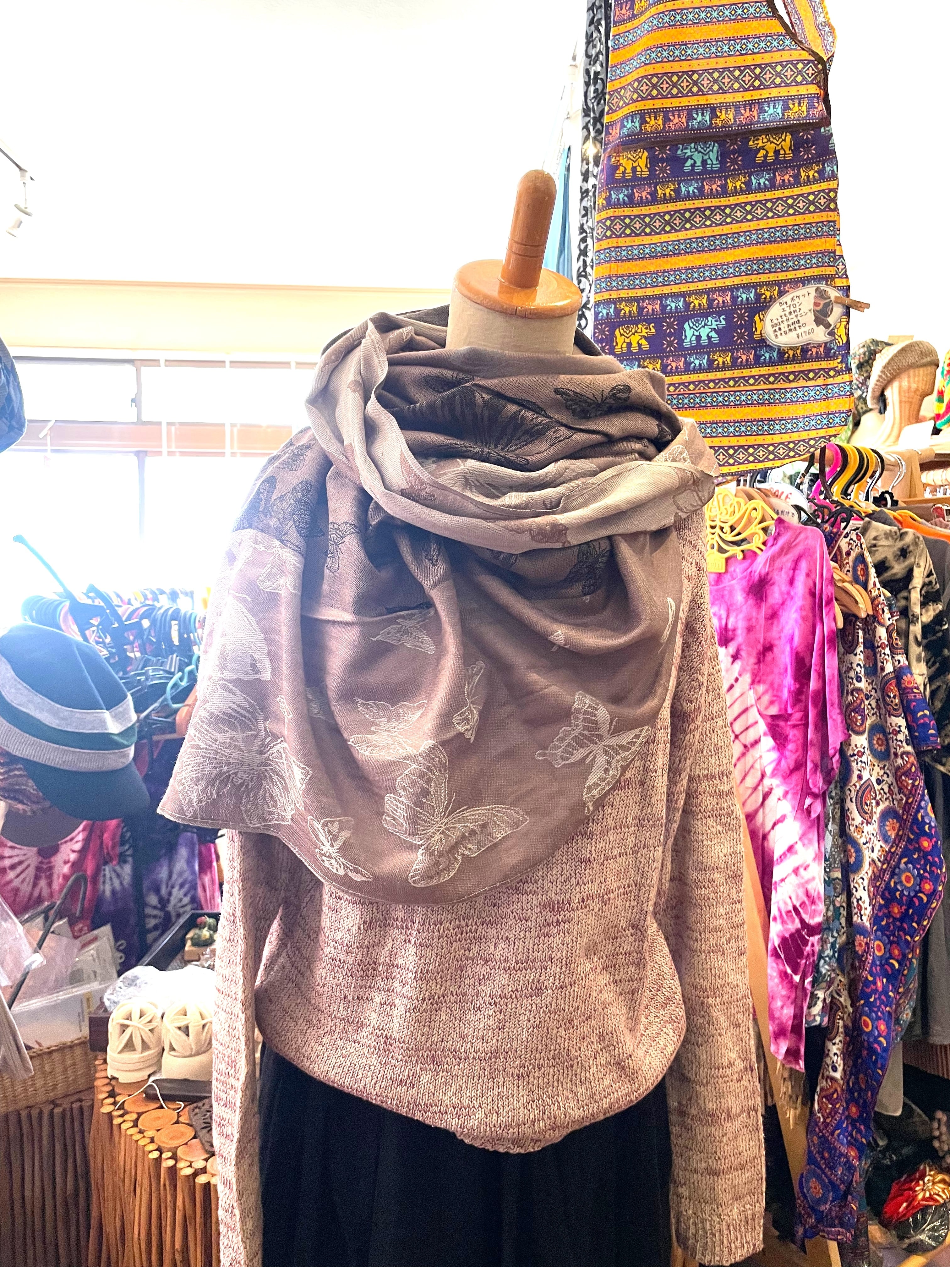 ストール 大判ストール 上品 柔らかい 光沢 リバーシブル リバーシブルストール 春 夏 秋 冬 マフラー アジアンストール 柄 エスニックファッション アフリカン エスニック パーティー プレゼント アジアン 蝶々柄 ライトブラウン グレー * アジアン雑貨 No.18 B