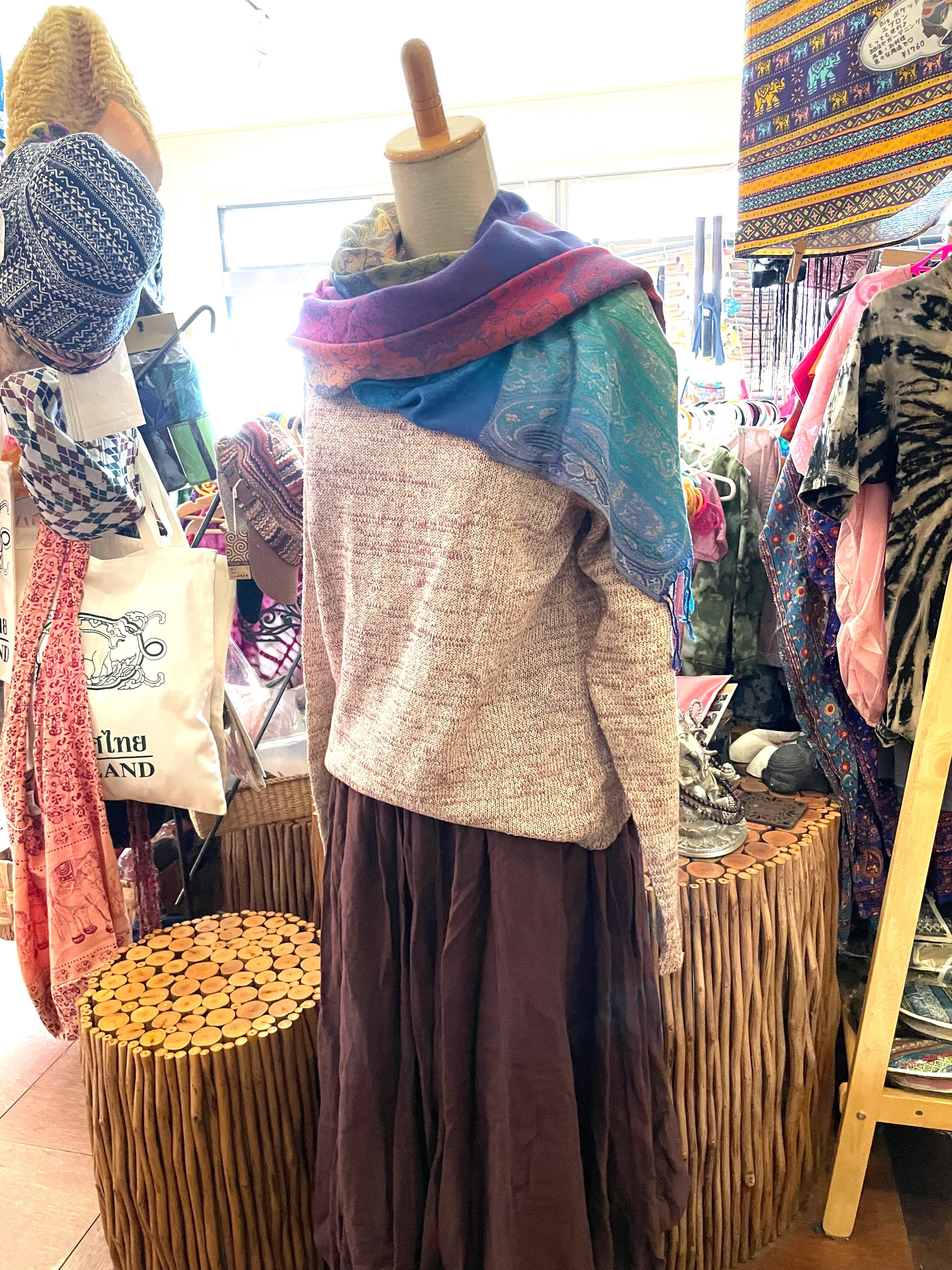 パシュミナストールは、カシミアの繊維を糸に紡ぎ織りあげるため、軽く・薄く・光沢感が高いという特徴を持ちます。