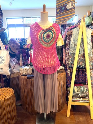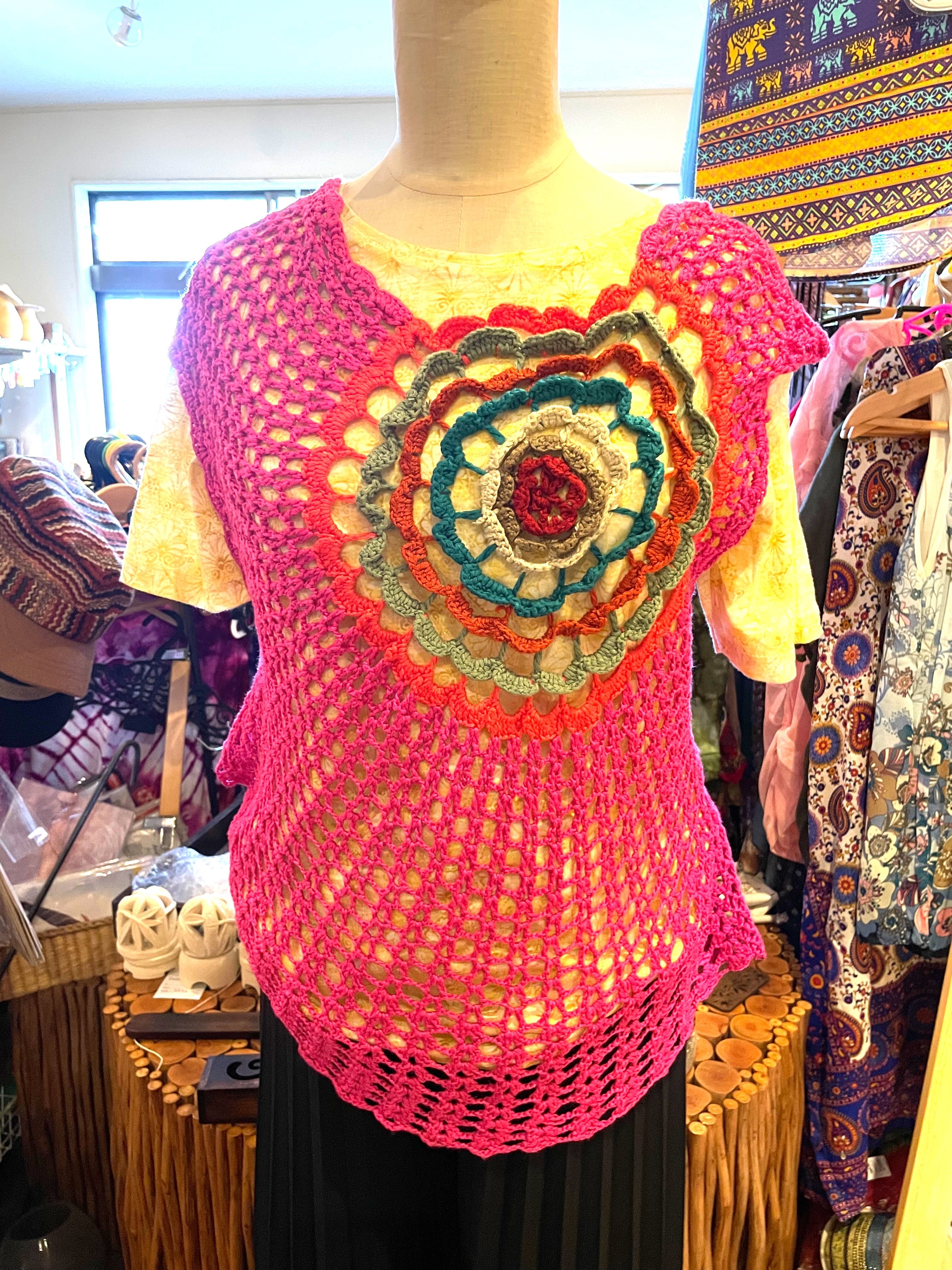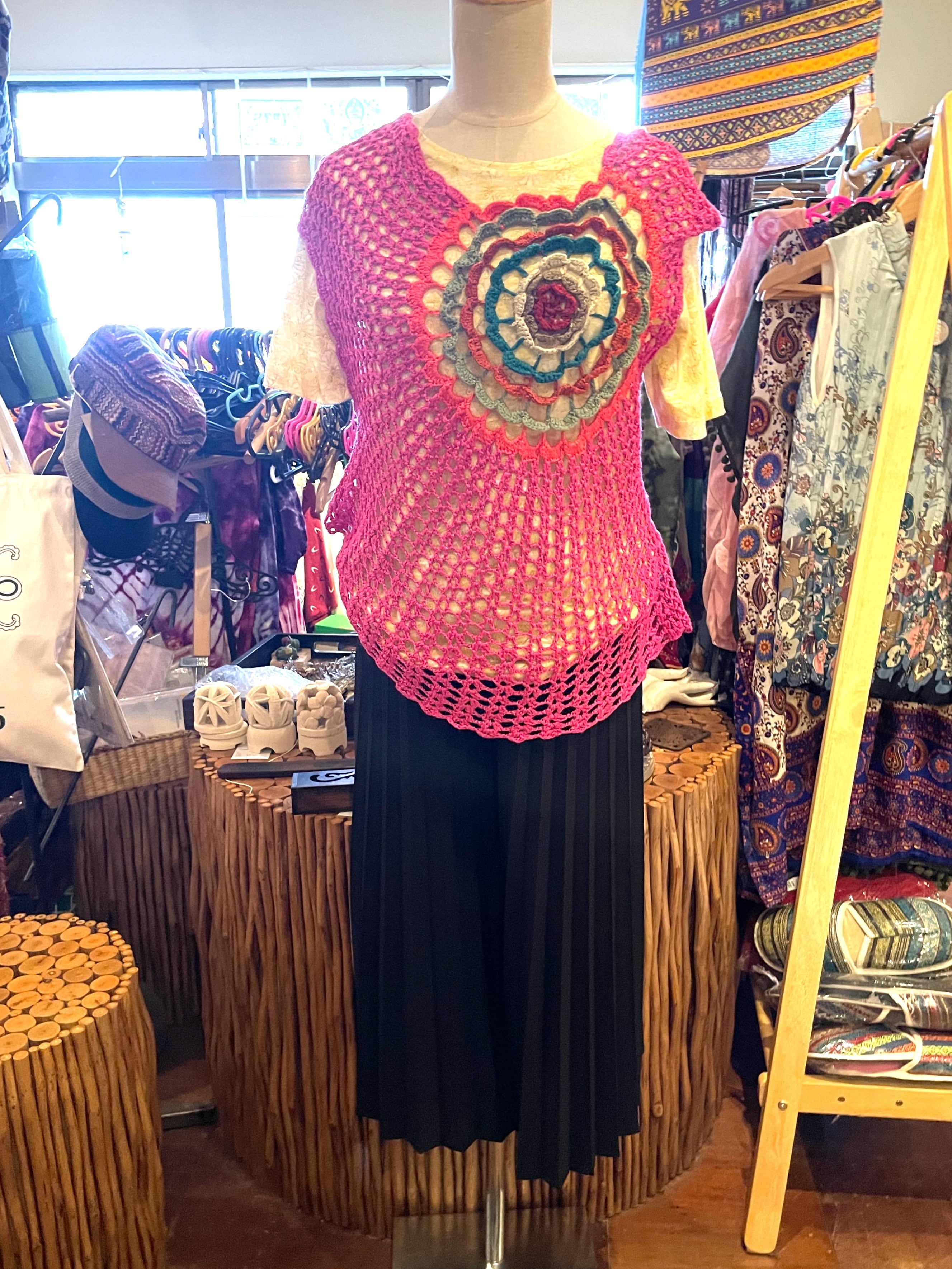 チュニック 半袖 手編みベスト 変形ベスト 花 コットン ベスト 個性的 ファッション エスニック 手編み 刺繍 ヒッピーファッション エスニックファッション アジアンファッション レトロ 花柄 かぎ編み ハンドメイド オールシーズン ピンク *アジアン雑貨No.288