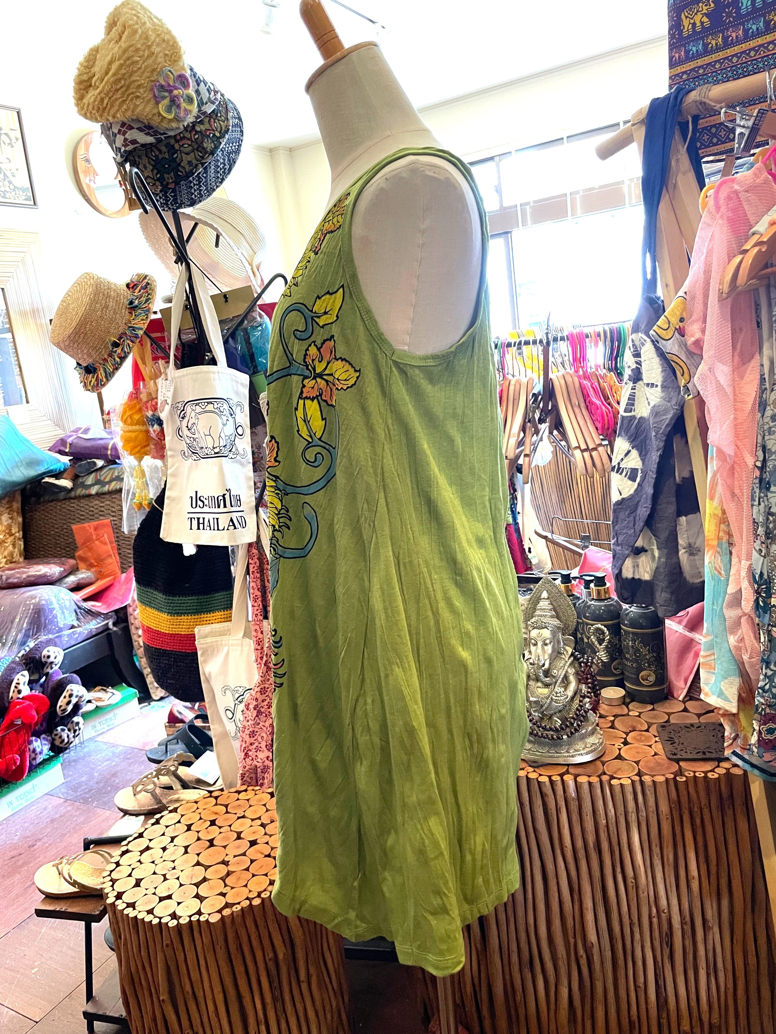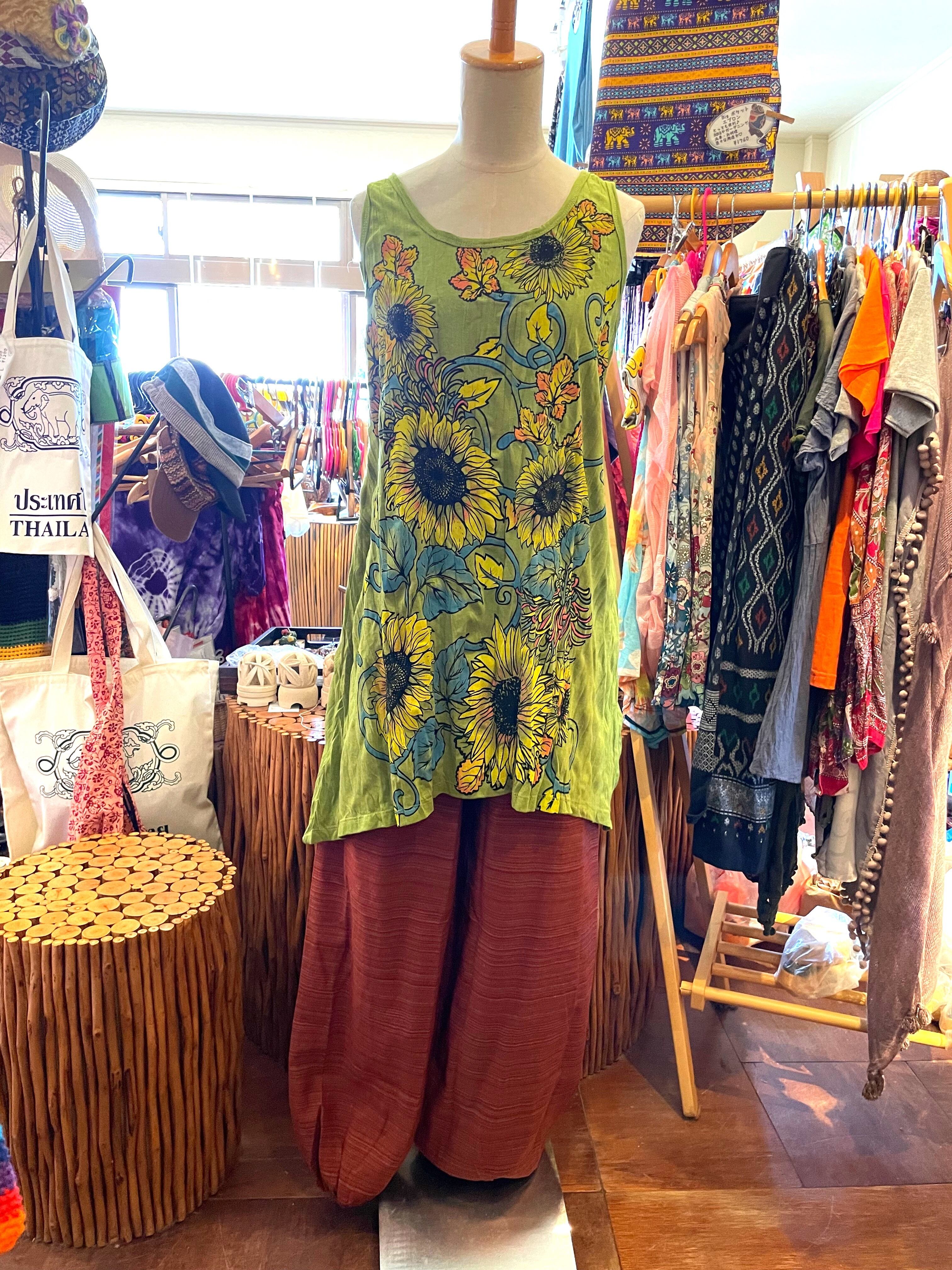 チュニック ワンピース ノースリーブワンピース クリンクル加工 Aライン 柔らかタンクトップ プリント タンクトップ ノースリーブ エスニックファッション アジアンファッション グリーン ひまわり アジアン雑貨 No.300