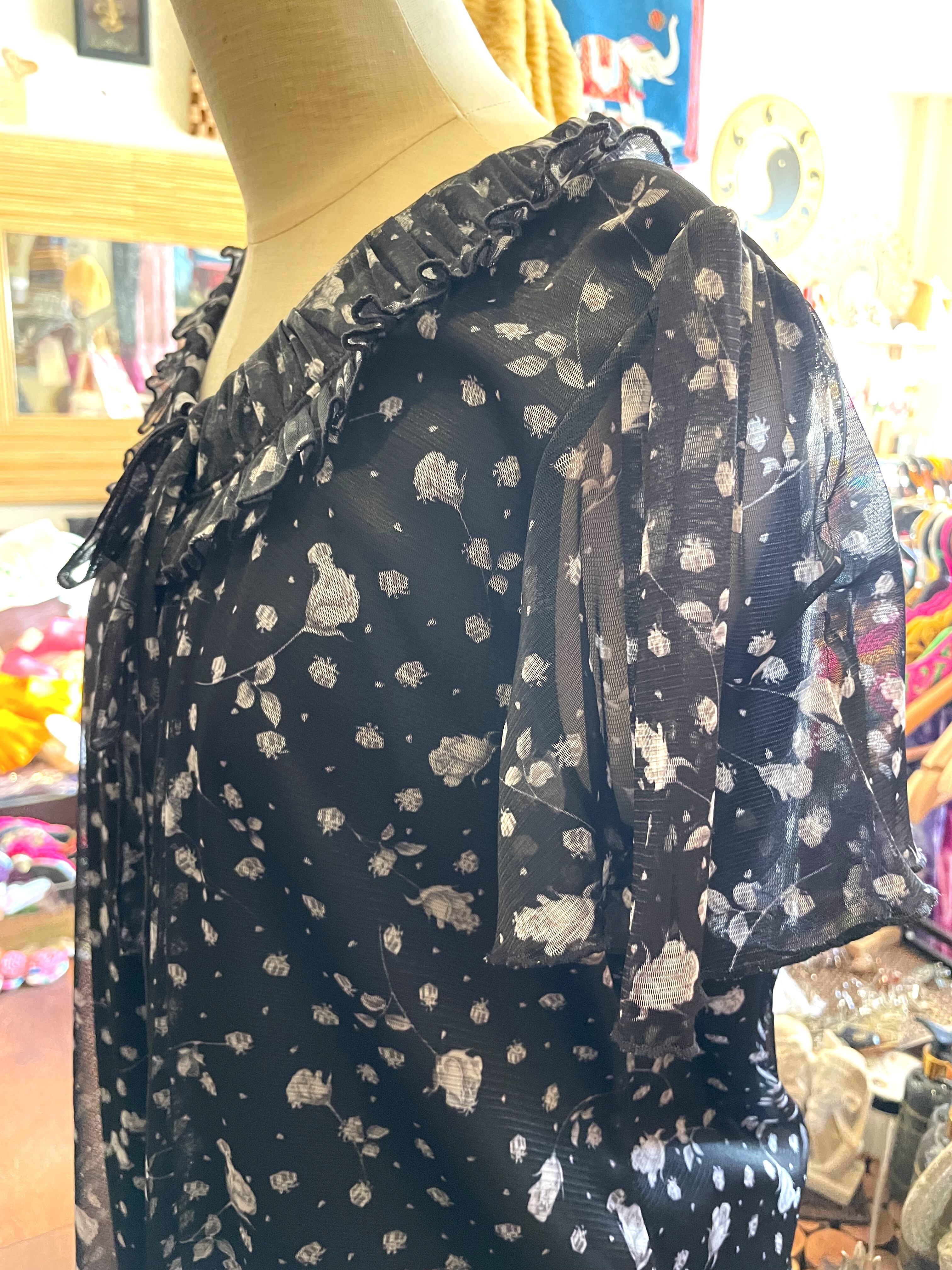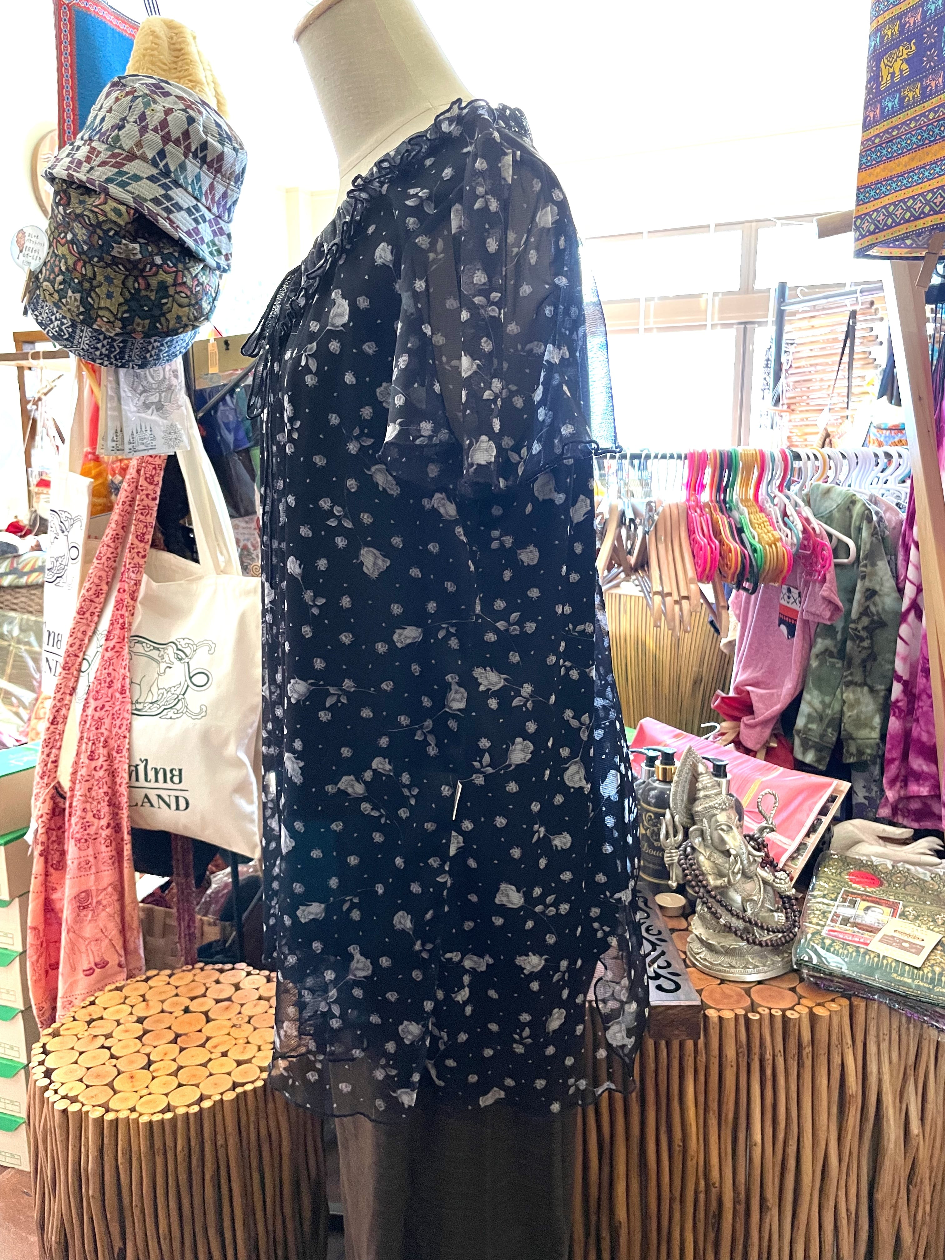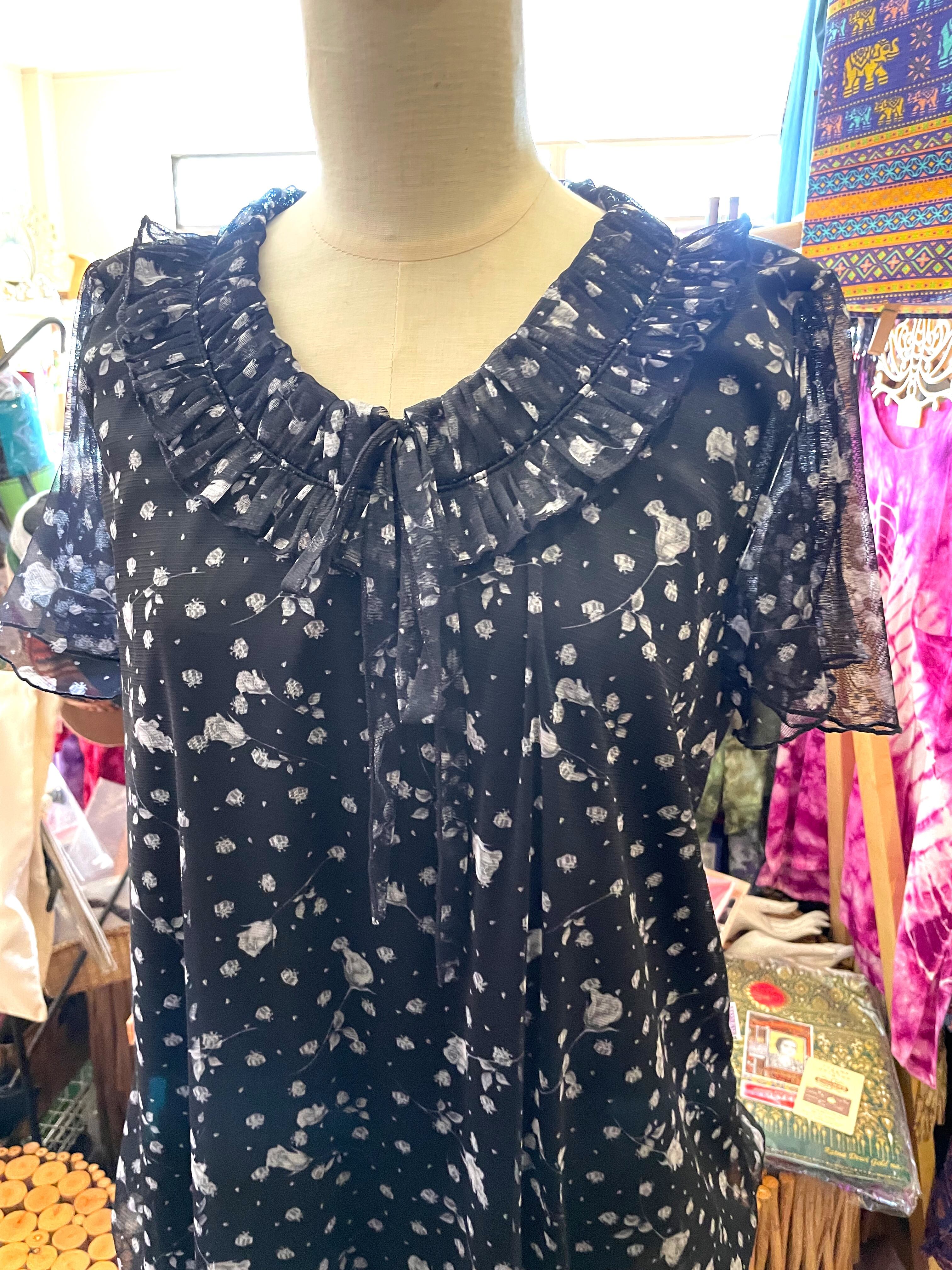 ブラウス 半袖 半袖レースチュニック チュニック フレアー シースルー 花柄 アジアン 裏地付き ネイビー * アジアン雑貨No.79