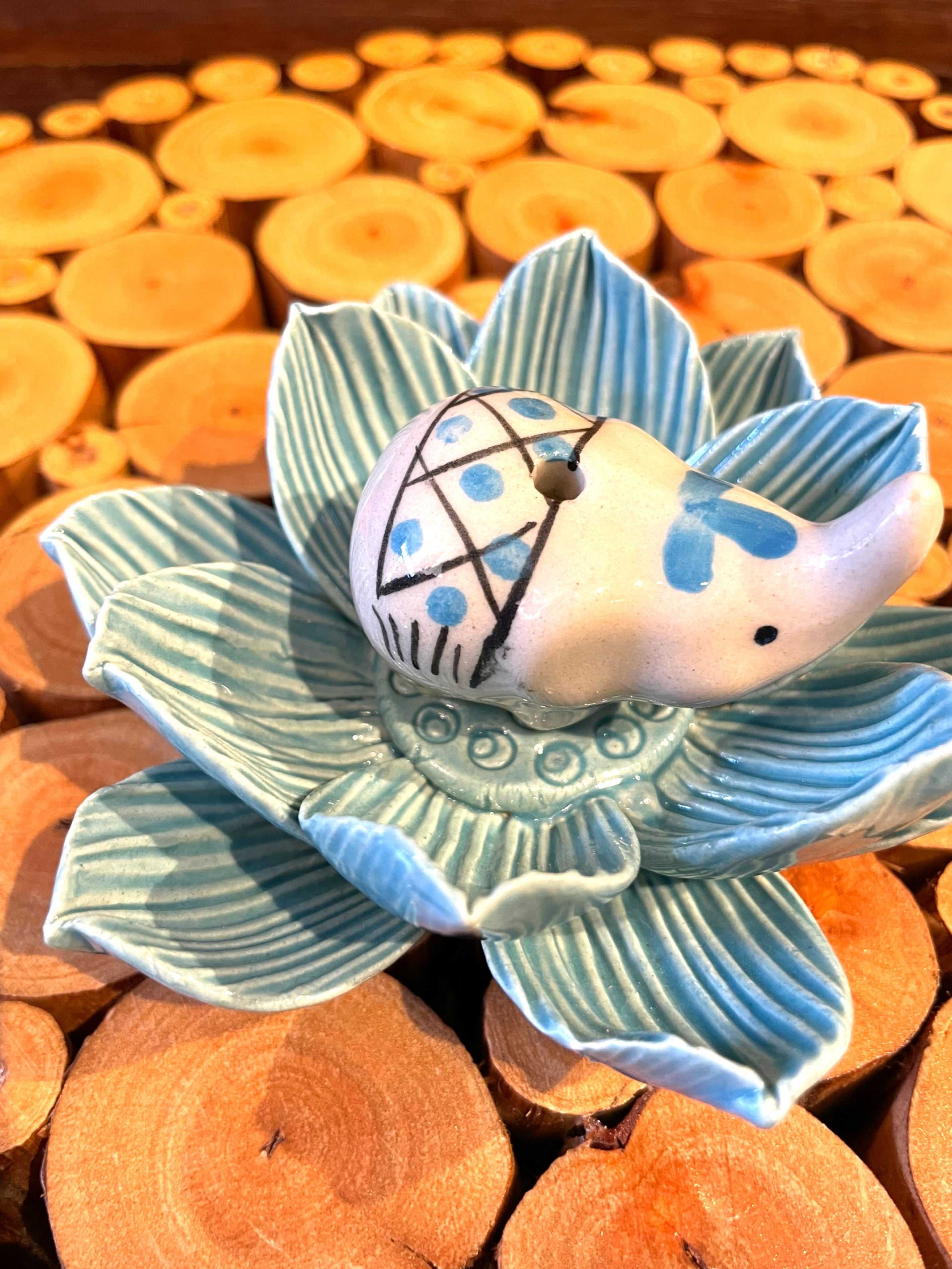 《蓮の花・ゾウお香ホルダー》ブルー・ゾウ柄
